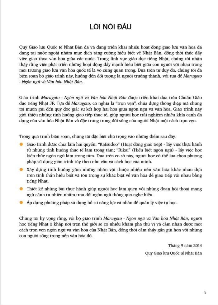 Marugoto là một giáo trình công phu và đầy tâm huyết của Nhật Bản với mong muốn phổ cập và nâng cao tiếng Nhật cho người nước ngoài ở khắp thế giới. Giáo trình được triển khai dựa trên Chuẩn Giáo dục tiếng Nhật JF. Tựa đề Marugoto, có nghĩa là “trọn vẹn”, đó cũng chính là thông điệp mà Quỹ Giao lưu Quốc tế Nhật Bản muốn gửi đến quý độc giả: sự kết hợp hài hòa giữa ngôn ngữ và văn hóa. Giáo trình này giới thiệu những tình huống giao tiếp thực tế, giúp người học trải nghiệm nhiều khía cạnh đa dạng của văn hóa Nhật Bản và đặc trưng trong đời sống của người Nhật một cách trọn vẹn.