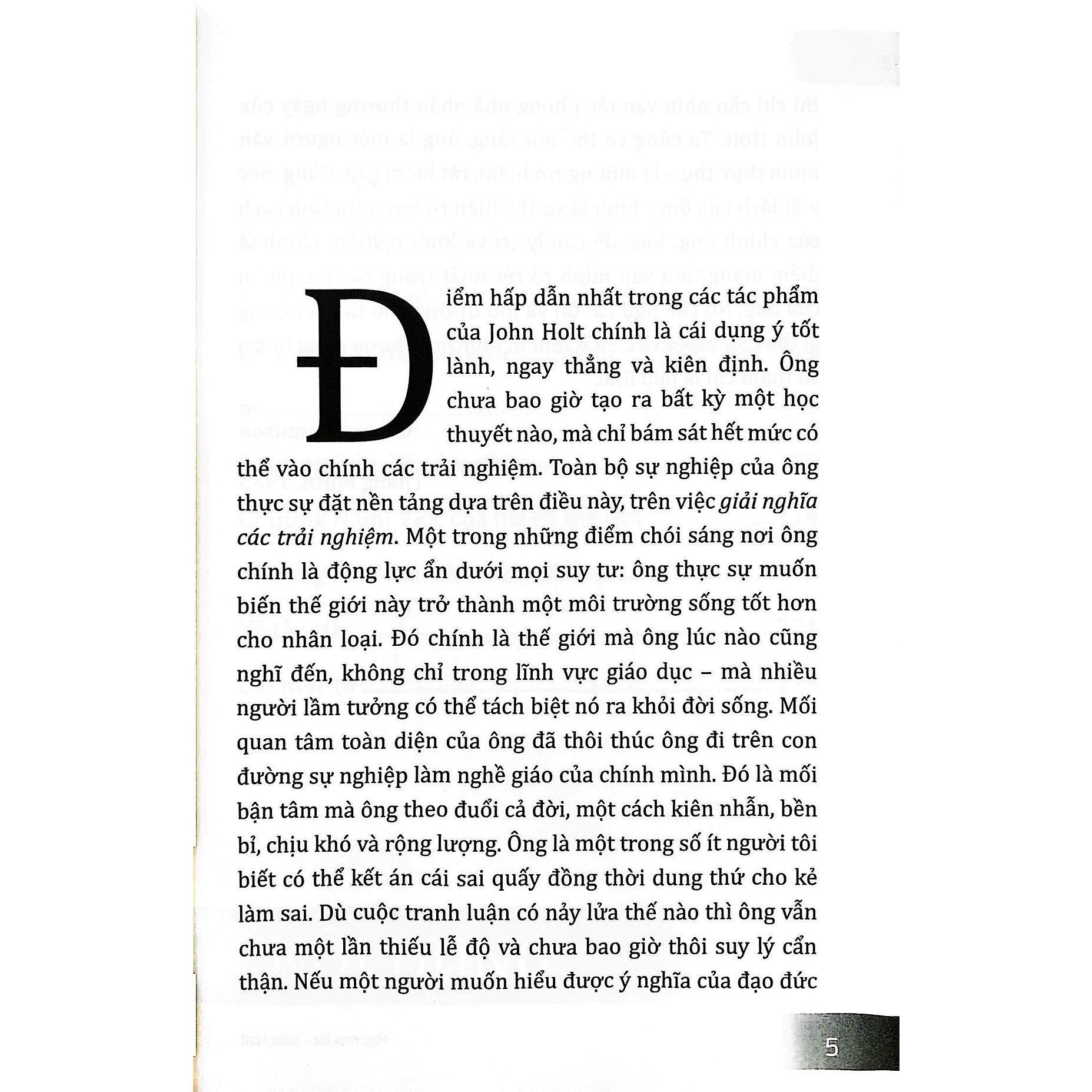 Theo Holt, học tập nên được xem như một quá trình tích cực và tự định hướng, trong đó các cá nhân theo đuổi kiến thức dựa trên sở thích và đam mê cá nhân của họ. Ông nhấn mạnh tầm quan trọng của việc cho phép trẻ em tự do khám phá trí tò mò của bản thân và học hỏi thông qua trải nghiệm thực tế, vui chơi và tương tác thực tế. Đồng thời, Holt cũng khám phá vai trò của phụ huynh và các nhà giáo dục trong việc tạo điều kiện thuận lợi cho việc học tập. Ông khuyến khích người lớn trở thành người hướng dẫn và hỗ trợ thay vì chỉ là người hướng dẫn, cung cấp nguồn lực và cơ hội cho trẻ em theo đuổi sở thích của m.ình và tham gia vào các trải nghiệm học tập có ý nghĩa. Holt ủng hộ một môi trường học tập thúc đẩy quyền tự chủ, tư duy phản biện, tính sáng tạo và kỹ năng giải quyết vấn đề.