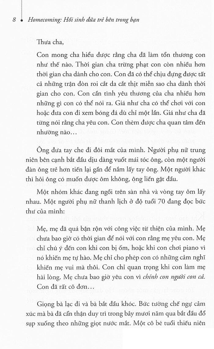 Homecoming - Hồi Sinh Đứa Trẻ Bên Trong Bạn “Ba điều đáng kinh ngạc mà công việc chữa lành đứa trẻ bên trong mang lại: tốc độ mà mọi người thay đổi; mức độ thay đổi; sức mạnh cũng như sự sáng tạo mà họ có được khi những vết thương trong quá khứ được chữa lành” Bradshaw chia sẻ. Đầu tiên, chúng ta nhìn thế giới bằng con mắt của một đứa trẻ nhỏ, và đứa trẻ ấy vẫn sẽ ở bên trong chúng ta trong suốt cuộc đời, bất kể chúng ta trưởng thành và mạnh mẽ ra sao. Nếu đứa trẻ dễ tổn thương của chúng ta tổn thương, bị bỏ rơi, xấu hổ, hoặc bị ngó lơ, thì nỗi đau, nỗi buồn và sự tức giận của đứa trẻ sẽ tồn tại mãi bên trong chúng ta. “Tôi tin rằng việc đứa trẻ bên trong bị bỏ rơi, tổn thương chính là nguồn gốc của sự khốn khổ ở con người”, ông nói. Bạn có khao khát được trở thành là một bậc cha mẹ yêu thương nhưng lại thường xuyên không thể và khiến con cái tổn thương? Bạn khao khát sự gần gũi nhưng lại tự hỏi có đáng để đấu tranh không? Đôi khi bạn bị mất năng lượng vì lo lắng hoặc trầm cảm chứ? Lúc đó, hãy trở về nhà, với con người thật của bạn có lẽ sẽ hữu ích. Trong cuốn sách thay đổi cuộc sống này, Homecoming: Hồi sinh đứa trẻ bên trong bạn, John Bradshawn đã chỉ cho chúng ta cách làm thế nào để nuôi dưỡng đứa trẻ bên trong đang thiếu thốn của m.ình, về bản chất chính là cung cấp cho chúng ta cách nuôi dạy con cái tốt nhất mà chúng ta cần và khao khát. Thông quá quá trình từng bước khám phá mỗi giai đoạn phát triển trong thời thơ ấu của m.ình, chúng ta có thể thoát khỏi những quy tắc gia đình làm tổn thương chính chúng ta và giải thoát m.ình tự do để sống có trách nhiệm ở thời điểm hiện tại. Cuốn sách cung cấp vô số các trường hợp, kỹ thuật tương tác, bao gồm các mục câu hỏi, thư viết tay không thuận, thiền định có hướng dẫn, nỗi buồn, lời khẳng định. Được coi là người tiên phong khi giới thiệu nhưng những liệu pháp cổ điển này đang được chứng thực bởi những khám phá mới trong nghiên cứu về sự gắn kết và khoa học thần kinh. Không ai có thể đưa chúng tới khán giả đại chúng hiệu quả và đầy cảm hứng như John Bradshaw. Các liệu pháp của ông đang được sử dụng khắp trên thế giới và được hàng triệu người tham dự. Cuốn sách được khuyên dùng cho các thư viện học thuật, chuyên nghiệp, tư nhân và công cùng những người đang tìm kiếm các cách để thực sự trở thành mẫu người mà họ muốn mọi người nghĩ họ là. Mục lục: Mở đầu PHẦN MỘT: NHỮNG VẤN ĐỀ CỦA “ĐỨA TRẺ BÊN TRONG” BỊ TỔN THƯƠNG Giới thiệu