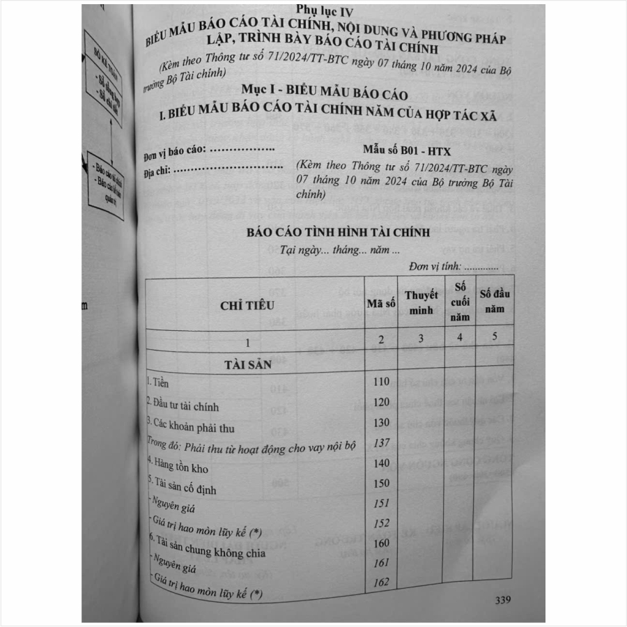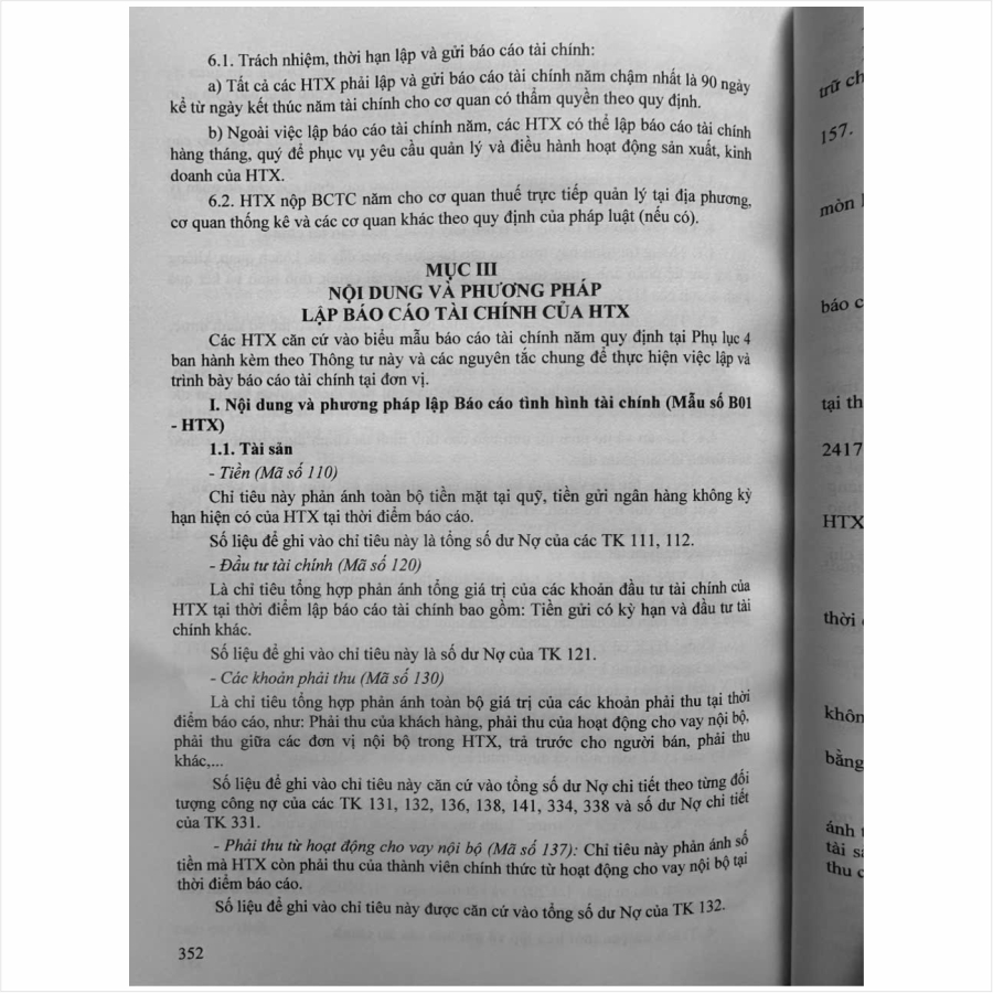 - Toàn bộ sách bìa mềm khổ lớn 19 x 27 cm phân phối bởi Nhà sách Nam Việt đều được bọc sách Plastic MIỄN PHÍ và xuất hóa đơn điện tử đầy đủ, nhanh chóng. …//… Lời giới thiệu: Ngày 07 tháng 10 năm 2024, Bộ Tài chính đã chính thức ban hành Thông tư số 71/2024/TT-BTC hướng dẫn Chế độ kếtoán hợp tác xã, liên hiệp hợp tác xã. Nhằm hướng dẫn về chứng từ kế toán, tài khoản kế toán, nguyên tắc ghi sổ kế toán, lập và trình bày Báo cáo tài chính của hợp tác xã, liên hiệp hợp tác xã; không áp dụng cho việc xác định nghĩa vụ thuế của hợp tác xã đối với ngân sách Nhà nước. Việc ghi sổ kế toán phải căn cứ vào các chứng từ kế toán được phản ánh trên cơ sở các giao dịch kinh tế phát sinh và đã hoàn thành. Hợp tác xã phải tuân thủ các quy định của pháp luật, cơ chế, chính sách liên quan khi thực hiện các giao dịch kinh tế. Nhằm phổ biến đến Quý Cơ quan, Đơn vị và Quý khách hàng thân thiết nắm bắt kịp thời những quy định mới nêu trên. Nhà sách Nam Việt xin trân trọng giới thiệu cuốn sách: Hướng Dẫn Chế Độ Kế Toán Hợp Tác Xã, Liên Hiệp Hợp Tác Xã theo Thông Tư Số 71/2024/TT-BTC ngày 07/10/2024 …//… Nội dung cuốn sách bao gồm những nội dung chính như sau: Chương I. QUY ĐỊNH CHUNG Chương II. QUY ĐỊNH CỤ THỂ Chương III. ĐIỀU KHOẢN THI HÀNH Phụ lục I. DANH MỤC HỆ THỐNG TÀI KHOẢN KẾ TOÁN Phụ lục II. DANH MỤC, BIỂU MẪU VÀ PHƯƠNG PHÁP LẬP CHỨNG TỪ KẾ TOÁN Phụ lục III. DANH MỤC SỔ KẾ TOÁN, BIỂU MẪU SỔ KẾ TOÁN VÀ PHƯƠNG PHÁP GHI SỔ KẾ TOÁN VÀ HÌNH THỨC SỔ KẾ TOÁN Phụ lục IV. BIỂU MẪU BÁO CÁO TÀI CHÍNH, NỘI DUNG VÀ PHƯƠNG PHÁP LẬP, TRÌNH BÀY BÁO CÁO TÀI CHÍNH *** Quý khách hàng hãy an tâm khi mua sách tại Nhà sách Nam Việt, cam kết uy tín, chất lượng, sách bản gốc chuẩn đẹp, được kiểm hàng, hài lòng mới thanh toán, sách đã được bọc plastic cao cấp miễn phí! …//… Cảm ơn các bạn đã ghé thăm shop Nhà sách Nam Việt ! Sách Hướng Dẫn Chế Độ Kế Toán Hợp Tác Xã, Liên Hiệp Hợp Tác Xã theo Thông Tư Số 71/2024/TT-BTC ngày 07/10/2024 Sách Hướng Dẫn Chế Độ Kế Toán Hợp Tác Xã, Liên Hiệp Hợp Tác Xã theo Thông Tư Số 71/2024/TT-BTC ngày 07/10/2024