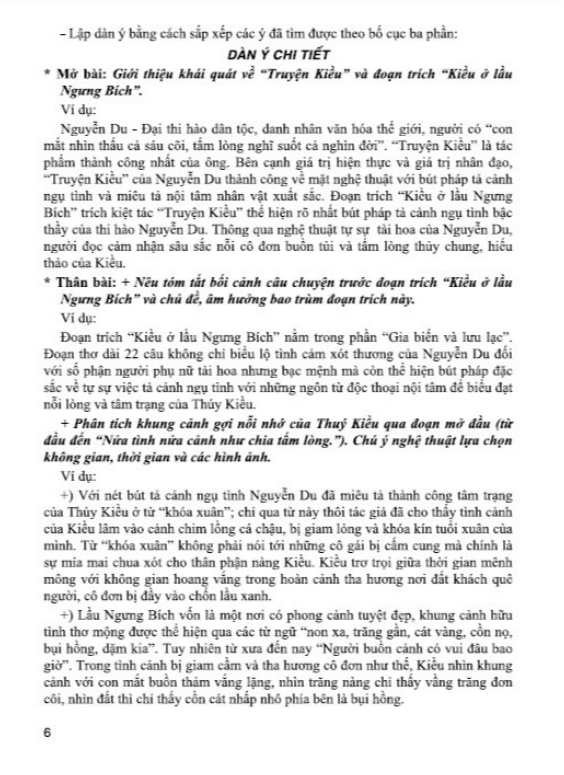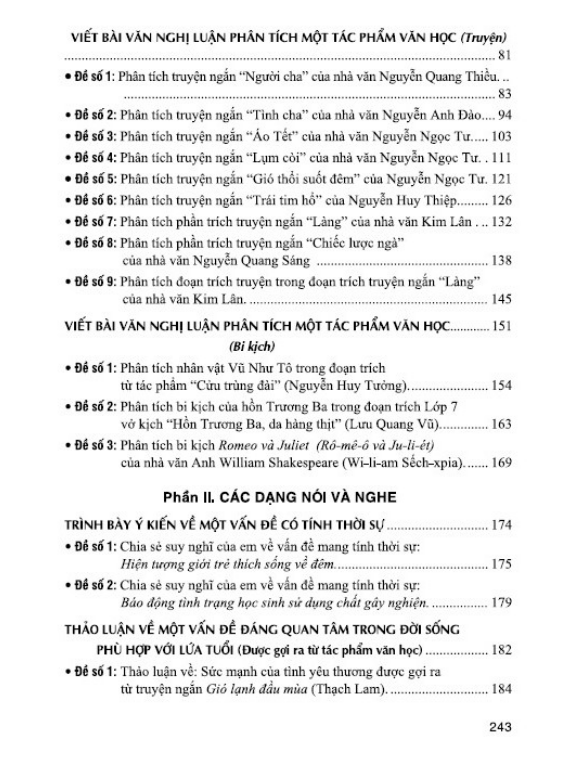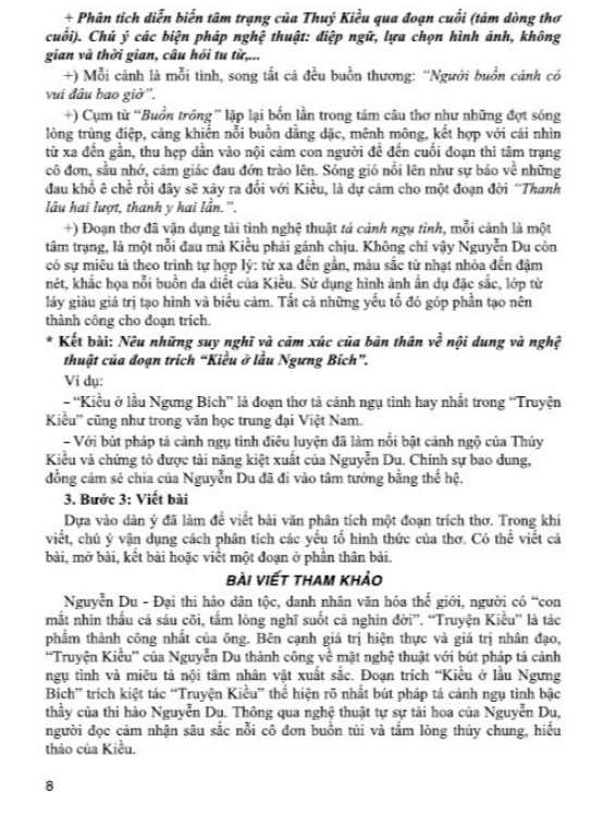 - Phần đề minh họa: các dàn ý và bài tham khảo (gợi ý dàn bài và bài văn hoàn chỉnh) hướng dẫn học sinh kĩ năng viết, nói – nghe. Cuốn sách là tâm huyết của nhóm tác giả đã nghiên cứu, trăn trở trong một thời gian dài. Tuy nhiên, do giới hạn về dung lượng và thời gian nên không thể chuyển tải hết được các ý tưởng. Vì vậy, khi sử dụng quý thầy cô và các em học sinh cần linh hoạt, sáng tạo để phù hợp với từng đối tượng và mức độ nhận thức của học sinh. Để sử dụng hiệu quả cuốn sách này, thầy cô và các em nên kết hợp chặt chẽ với sách giáo khoa. Trong quá trình biên soạn, cuốn sách không tránh khỏi những thiếu sót nhất định. Nhóm tác giả rất mong nhận được ý kiến đóng góp chân thành từ các bạn đọc gần xa đặc biệt là các quý thầy cô cùng các em học sinh thân yêu để cuốn sách được hoàn thiện hơn trong lần tái bản sau.