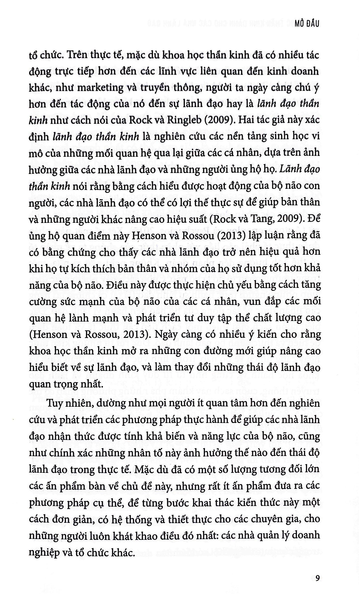 cuốn sách “khoa học thần kinh dành cho các nhà lãnh đạo” đã bật mí bí ẩn về sự lãnh đạo, nó bắt nguồn từ một nơi rất cụ thể và hữu hình: bộ não con người. tuy nhiên, dường như mọi người ít quan tâm đến nghiên cứu và phát triển các phương pháp thực hành để giúp các nhà lãnh đạo nhận thức được tính khả biến và năng lực của bộ não, cũng như chính xác những nhân tố này ảnh hưởng thế nào đến thái độ lãnh đạo trong thực tế.