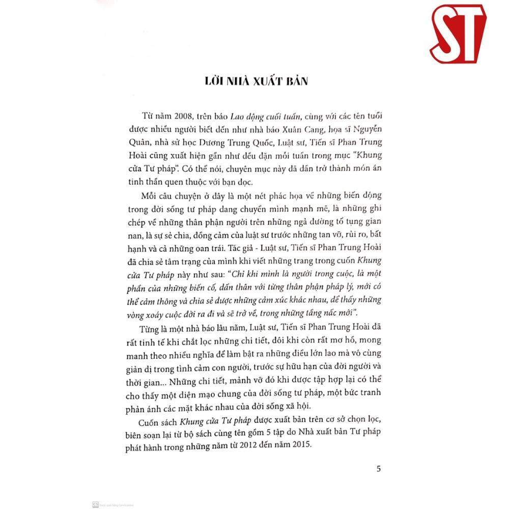Mua tại TiktokNhà xuất bản Chính trị quốc gia Sự thật Tác giả: Luật sư - Tiến sĩ Phan Trung Hoài Năm xuất bản: 2022 Số trang: 436 Cuốn sách Khung cửa Tư pháp được xuất bản trên cơ sở chọn lọc, biên soạn lại từ bộ sách cùng tên gồm 5 tập do Nhà xuất bản Tư pháp phát hành trong những năm từ 2012 – 2015. Mỗi câu chuyện ở đây là một nét phác hoạ về những biến động trong đời sống tư pháp đang dần chuyển mình mạnh mẽ, là ghi chép về những thân phận người trên những ngả đường tố tụng gian nan, là sự sẻ chia, đồng cảm của luật sư trước những tan vỡ, rủi ro, bất hạnh và cả những oan trái.