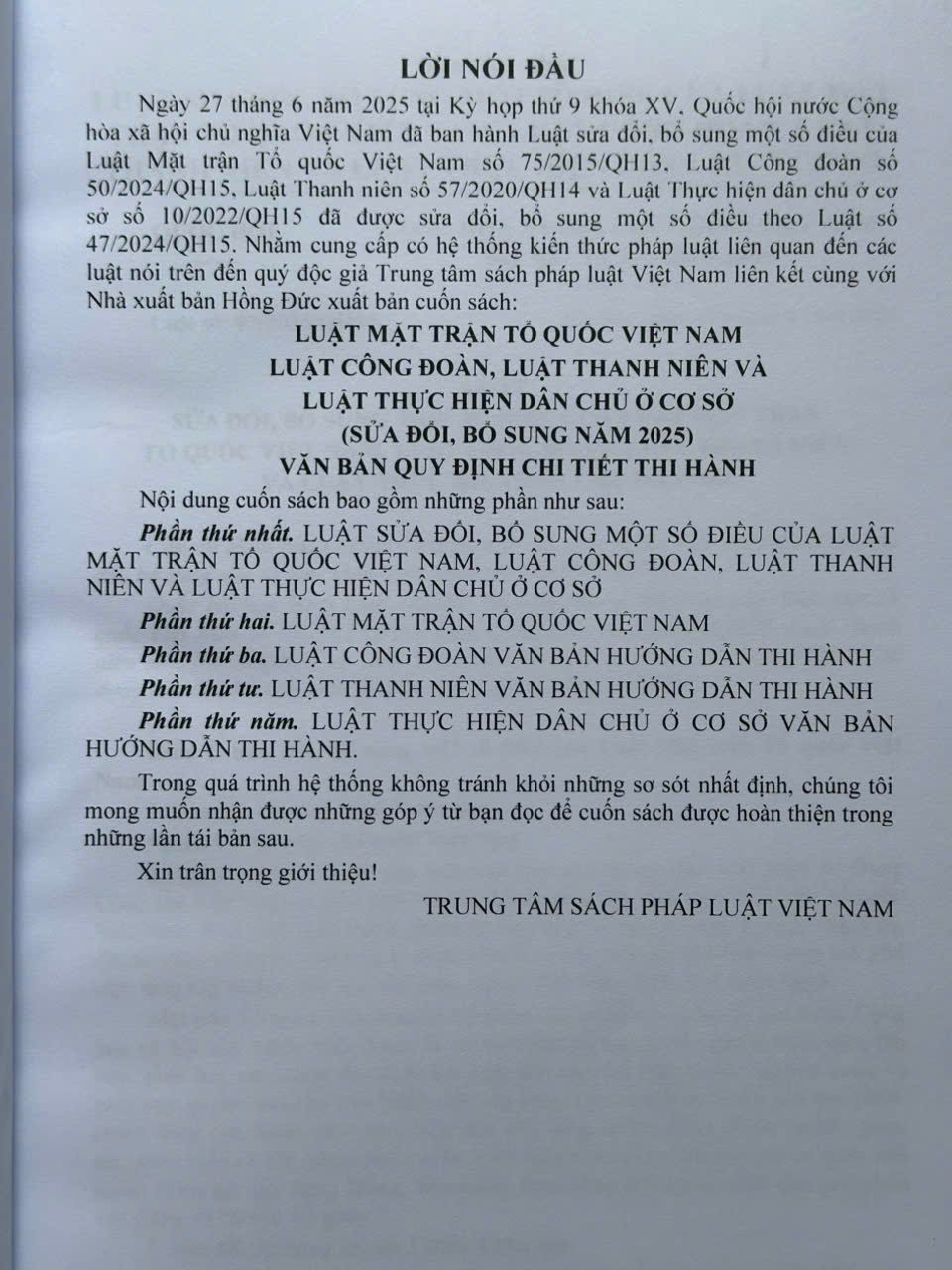 Nhằm phổ biến đến Quý Cơ quan, Đơn vị và Quý khách hàng thân thiết nắm bắt kịp thời những quy định mới nêu trên. Nhà sách Nam Việt xin trân trọng giới thiệu cuốn sách: Luật Mặt Trận Tổ Quốc Việt Nam, Luật Công Đoàn, Luật Thanh Niên Và Luật Thực Hiện Dân Chủ Ở Cơ Sở (sửa đổi, bổ sung năm 2025) – Văn Bản Quy Định Chi Tiết Thi Hành
