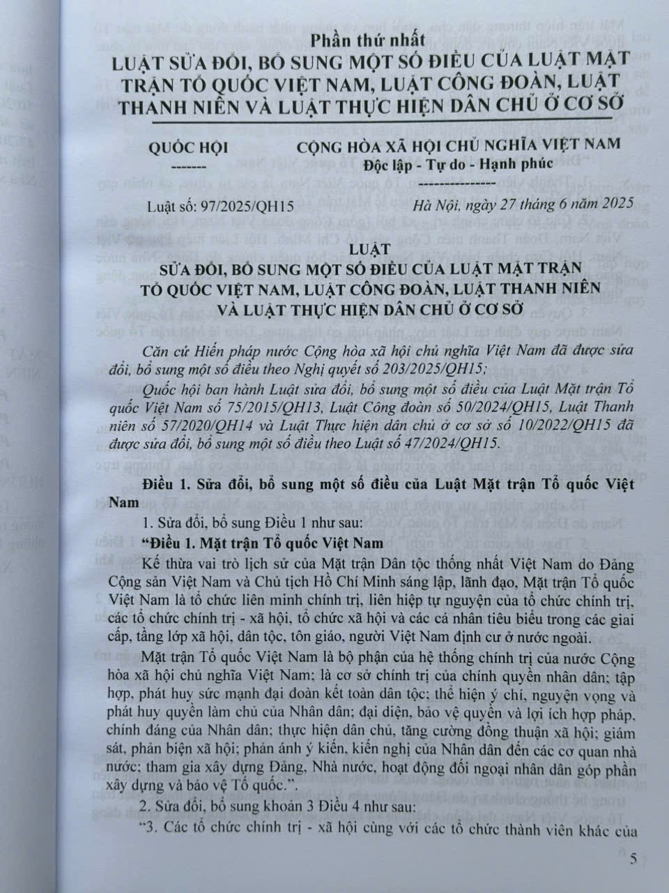 Ngày 27 tháng 6 năm 2025 tại Kỳ họp thứ 9 khóa XV, Quốc hội nước Cộng hòa xã hội chủ nghĩa Việt Nam đã ban hành Luật sửa đổi, bổ sung một số điều của Luật Mặt trận Tổ quốc Việt Nam số 75/2015/QH13, Luật Công đoàn số 50/2024/QH15, Luật Thanh niên số 57/2020/QH14 và Luật Thực hiện dân chủ ở cơ sở số 10/2022/QH15 đã được sửa đổi, bổ sung một số điều theo Luật số 47/2024/QH15.