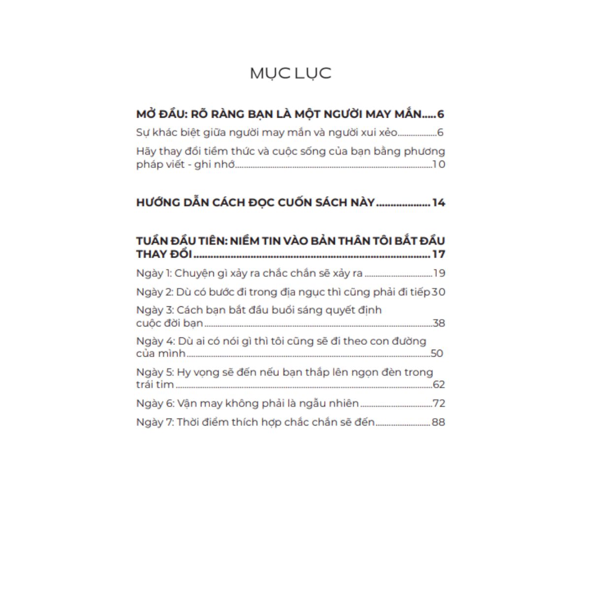 Sách- Luật may mắn: 21 ngày tái tạo năng lượng để thu hút thành công Nội dung cuốn sách Luật may mắn: 21 ngày tái tạo năng lượng để thu hút thành công Cuốn sách "Luật may mắn: 21 ngày tái tạo năng lượng để thu hút thành công" như một lời khẳng định mạnh mẽ rằng: May mắn không phải là đặc ân được ban phát ngẫu nhiên, mà là kết quả của sự nỗ lực không ngừng nghỉ và năng lượng tích cực toả ra từ chính bạn. Tác giả Chae-Hwan, bằng kiến thức sâu rộng về tâm lý học và luật hấp dẫn, đã khéo léo dẫn dắt người đọc qua những câu chuyện đời thường, những minh chứng sống động về sức mạnh của suy nghĩ tích cực trong việc kiến tạo cuộc sống. Hành trình 21 ngày đánh thức tiềm năng bên trong bạn "Luật may mắn" không chỉ là cuốn sách truyền cảm hứng đơn thuần, mà còn là cẩm nang thực hành với lộ trình rõ ràng, bài bản, giúp bạn từng bước thay đổi bản thân và thu hút những điều tốt đẹp đến với mình. Cuốn sách được ví như một hành trình 21 ngày, được chia thành ba giai đoạn, mỗi giai đoạn là một tuần với những bài học và bài tập thực hành được thiết kế logic: Tuần lễ niềm tin: Mở đầu hành trình, bạn sẽ được "gỡ rối" khỏi những suy nghĩ tự ti, mặc định bản thân là kẻ thất bại - những rào cản vô hình ngăn cách bạn với thành công. "Tuần lễ niềm tin" sẽ khai mở tiềm thức, giúp bạn nhận ra giá trị của bản thân, khơi dậy sức mạnh tiềm ẩn và gieo mầm cho sự tự tin. Bạn sẽ học cách thấu hiểu chính mình, xác định điểm mạnh, điểm yếu và tiềm năng phát triển để từ đó, xây dựng một phiên bản tốt đẹp hơn của chính mình. Tuần lễ biết ơn: Trong xã hội hiện đại đầy rẫy lo toan, chúng ta thường bị cuốn vào guồng quay của công việc, của những mục tiêu xa vời mà quên mất giá trị của những điều bình dị xung quanh. Chúng ta chạy theo những gì mình chưa có, để rồi bỏ quên hiện tại và đánh mất cảm giác hạnh phúc. "Tuần lễ biết ơn" chính là lời nhắc nhở bạn sống chậm lại, học cách trân trọng hiện tại, biết ơn những điều nhỏ bé mà cuộc sống đã ban tặng: gia đình, bạn bè, sức khoẻ, công việc, Tấm lòng biết ơn sẽ là chất xúc tác diệu kỳ giúp bạn thay đổi góc nhìn về cuộc sống, từ đó thu hút năng lượng tích cực và tạo ra những thay đổi bất ngờ. Tuần lễ hy vọng: Cuộc sống luôn đầy rẫy những khó khăn và thử thách, sẽ có lúc bạn cảm thấy mỏi mệt, muốn buông xuôi. Những lúc như vậy, bạn cần hơn bao giờ hết một nguồn động lực mạnh mẽ để tiếp tục vững bước trên con đường mình đã chọn. "Tuần lễ hy vọng" sẽ là "liều thuốc bổ" tiếp thêm cho bạn năng lượng tích cực, thắp sáng ngọn lửa lạc quan và thôi thúc bạn hành động để biến ước mơ thành hiện thực. Niềm tin và hy vọng chính là đôi cánh đưa bạn đến với thành công và hạnh phúc, hãy để "Luật may mắn" chắp cánh cho những khát khao của bạn. Viết - Ghi nhớ - Hành động: Công thức đơn giản để thay đổi vận mệnh Điểm khác biệt của cuốn sách nằm ở phương pháp tiếp cận đơn giản nhưng vô cùng hiệu quả: "Viết - Ghi nhớ". Mỗi ngày, bạn sẽ được tiếp nhận những thông điệp tích cực, những câu thần chú may mắn được đúc kết súc tích, dễ nhớ. Đây không phải là những lời khuyên sáo rỗng mà là những đúc kết cô đọng từ chính trải nghiệm của tác giả và những người thành công trên thế giới. Bằng việc dành thời gian đọc to, viết lại và nghiền ngẫm những thông điệp ấy mỗi ngày, bạn đang từng bước "lập trình" lại tiềm thức của mình, thay thế những suy nghĩ tiêu cực bằng những hạt mầm của sự lạc quan, hy vọng và thành công. Bạn sẽ ngạc nhiên bởi sức mạnh kỳ diệu của những dòng chữ tích cực tác động lên tâm trí, dần dần định hình thái độ sống và thu hút những điều tốt đẹp đến với bạn.