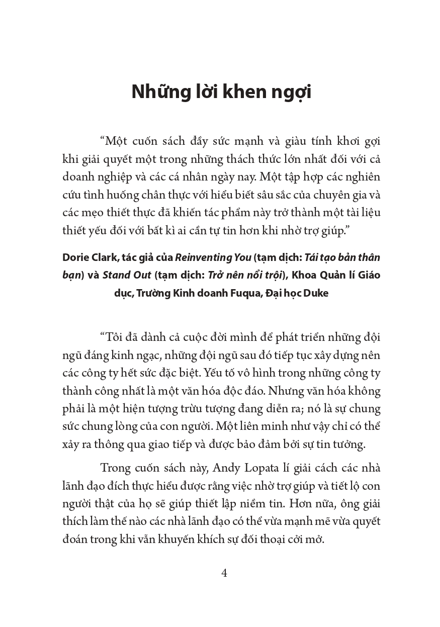 Trong cuốn sách này, tác giả Andy Lopata khám phá sự thay đổi cần thiết trong tư duy để ra có thể đón nhận sự hỗ trợ từ các mạng lưới của mình và sức mạnh của việc đó. Ông cũng thảo luận về tác động của tính minh bạch đối với thành tích của cá nhân và tập thể, đồng thời minh họa bằng các nghiên cứu điển hình dựa trên các cuộc phỏng vấn độc quyền về cách điều này ảnh hưởng đến mọi người thuộc tầng lớp xã hội.