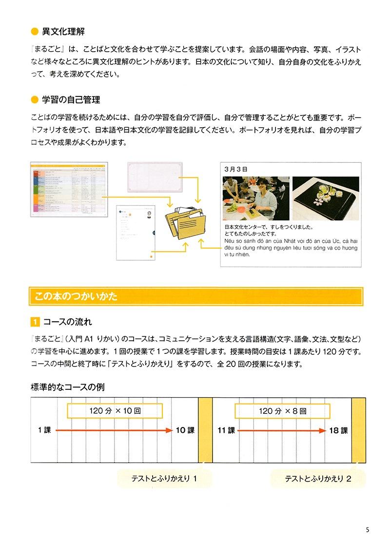 Marugoto - Ngôn Ngữ Và Văn Hóa Nhật Bản - Nhập Môn A1 - Hiểu Biết Ngôn Ngữ Giáo trình Marugoto - Ngôn ngữ và Văn hóa Nhật Bản được triển khai dựa trên Chuẩn Giáo dục tiếng Nhật JF. Tựa đề Marugoto, có nghĩa là “trọn vẹn”, chứa đựng thông điệp mà ban biên soạn muốn gửi đến quý độc giả: sự kết hợp hài hòa hài hòa giữa ngôn ngữ và văn hóa. Giáo trình Marugoto sử dụng nhiều tranh ảnh, hình minh họa với màu sắc sống động giúp người học tiếp thu kiến thức qua nhiều giác quan, hiểu thêm về văn hóa Nhật Bản. Marugoto kết hợp vừa giảng dạy tiếng Nhật và nâng cao hiểu biết văn hóa Nhật Bản. Người học có thể học văn hóa Nhật Bản thông qua việc tiếp cận với nhiều chủ đề như: du lịch, ẩm thưc, lễ hội, truyện tranh… Marugoto tập trung vào các tình huống giao tiếp thực tế bằng tiếng Nhật. Tuy nhiên, giáo trình này không hướng đến mục tiêu gia tăng lượng kiến thức về các mẫu câu, ngữ pháp.. Người học lấy các “Can-do” làm mục tiêu, theo đó học kiến thức liên quan đến tiếng Nhật để ứng dụng trong hoàn cảnh thực tế (mỗi bài học sẽ có các “Can-do” - những mục tiêu cần đạt được trong ngữ cảnh bài học đưa ra). Ở trình độ Nhập môn – trình độ dành cho người mới bắt đầu học, người học sẽ thực hiện các hoạt động giao tiếp đơn giản như: chào hỏi, nói về món ăn yêu thích hay về sở thích của bản thân. Ở trình độ Trung cấp, người học sẽ đọc, nghe tiếng Nhật thực tế, đồng thời luyện tập để có thể nói những đoạn dài về bản thân m.ình. Nói chung trình độ nào của giáo trình cũng hướng tới mục tiêu hiểu biết lẫn nhau thông qua việc giao tiếp thực tế bằng tiếng Nhật. Người học sử dụng giáo trình Marugoto có thể bắt đầu học tiếng Nhật cũng như văn hóa Nhật Bản một cách hứng thú thông qua việc tiếp cận với loạt hình ảnh minh họa sống động. Ngoài ra, người học sẽ được nghe nhiều đoạn hội thoại khác nhau và được luyện tập hội thoại theo từng ngữ cảnh thông qua các hoạt động giao tiếp như: thông tin cá nhân, thông tin gia đình, mua sắm, hàng xóm, công việc, những tình huống trao đổi thông tin về các sự việc gần gũi thường ngày trong phạm vi đơn giản và thường nhật. Ở trình độ Nhập môn (A1), giáo trình bao gồm hai cuốn: Katsudoo–Hoạt động giao tiếp và Rikai – Hiểu biết ngôn ngữ. Cuốn “Marugoto A1 Hoạt động giao tiếp” hướng tới mục tiêu nâng cao năng lực giao tiếp thực tế thông qua hai kỹ năng: nghe và nói. Với cuốn “Marugoto A1 Hiểu biết ngôn ngữ”, người học có thể nắm bắt một cách hệ thống những cấu trúc ngữ pháp để sử dụng trong hội thoại. Cả 2 cuốn sách này đều là giáo trình chính khi giảng dạy và có các chủ đề giống nhau. Người học có thể nâng cao năng lực tiếng Nhật một cách toàn diện thông qua việc học kết hợp hai cuốn sách này. Marugoto còn có một trang học tiếng Nhật trực tuyến để hỗ trợ người học trong quá trình học. Tại trang học này (), người học có thể tra từ trong mục “Marugoto no kotoba” hoặc xem các video liên quan trong mục “Marugoto +”. Với những người không thể tham gia khóa học thực tế, trang “Minato” () sẽ là một công cụ hữu ích để các bạn có thể học miễn phí giáo trình Marugoto mà không cần đến lớp. Hay tải miễn phí các phần mềm hỗ trợ học chữ cái “Hiragana/ Katakana/ Kanji Memory Hint”. Bên cạnh đó, người học còn có thể tải miễn phí các dữ liệu âm thanh của Marugoto trên trang: . Ngoài ra, trang này còn cung cấp nhiều tài liệu miễn phí khác như danh sách từ vựng…Đồng thời, các tài liệu hỗ trợ giảng dạy dành cho các giáo viên sử dụng Marugoto như : “Hướng dẫn phương pháp giảng dạy” (bản tiếng Nhật) cũng được đăng tải trên trang này. Giáo trình Marugoto – ngôn ngữ và Văn hóa Nhật Bản hy vọng người học tiếng Nhật ở khắp nơi trên thế giới sẽ có nhiều khám phá thú vị và cảm nhận được một cách trọn vẹn ngôn ngữ và văn hóa Nhật Bản, đồng thời cảm thấy gần gũi hơn với những con người sống trong nền văn hóa đó.