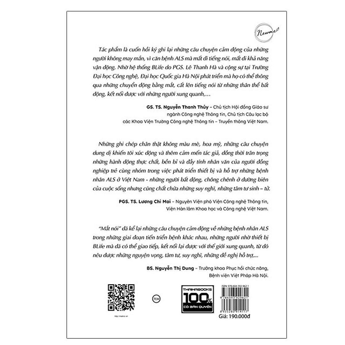 MẮT NÓI – Những tiếng nói được hồi sinh từ ánh mắt Công ty phát hành: Thái Hà Tác giả: Lê Thanh Hà Số trang: 316 trang Nhà xuất bản: Thế Giới Khổ: 14.5 x 20.5 cm Năm xuất bản: 2023 Nội dung quyển sách “Mắt Nói” bao gồm 10 phần chính, mỗi phần kể về hành trình của tác giả cùng nhóm nghiên cứu tiếp cận để hỗ trợ một người bệnh. Hành trình trên những con đường không trải đầy hoa hồng. Có những khó khăn tưởng chừng như không thể vượt qua, có những trở ngại tác động trực tiếp đến tâm lý và thể chất của nhiều người trong cuộc, có những giọt nước mắt, có những nụ cười. Rồi khi người bệnh tiếp cận được thiết bị hỗ trợ giao tiếp BLife, rất nhiều câu chuyện trong suốt khoảng thời gian dài câm lặng đã được đôi mắt của họ nói lại, kể lại và viết lại. Tóm tắt nội dụng: Như chính cái tên “Mắt nói”, Tác phẩm là cuốn hồi ký ghi lại những câu chuyện cảm động của những người không may mắn, vì căn bệnh ALS mà mất đi tiếng nói, mất đi khả năng vận động. Nhờ hệ thống BLife do PGS. Lê Thanh Hà và cộng sự tại Trường Đại học Công nghệ, Đại học Quốc gia phát triển mà họ có thể thông qua những chuyển động bằng mắt, cất lên tiếng nói từ những thân thể bất động, kết nối được với những người xung quanh,… “Mắt nói” cũng hé mở câu chuyện nghề của những nhà nghiên cứu khoa học máy tính, tuy không ồn ào nhưng âm thầm và kiên trì theo đuổi triết lý “công nghệ vị nhân sinh”, dùng các giải pháp kỹ thuật tiên tiến để hỗ trợ con người. Tác phẩm cũng thể hiện những góc nhìn về đời sống rất sâu sắc của dân công nghệ, những người nhiều khi được hình dung là khô khan, nhiều lý trí, ít cảm xúc, nhưng thực chất cũng đầy lòng yêu thương và trắc ẩn. Công ty Cổ phần Sách Thái Hà trân trọng giới thiệu!