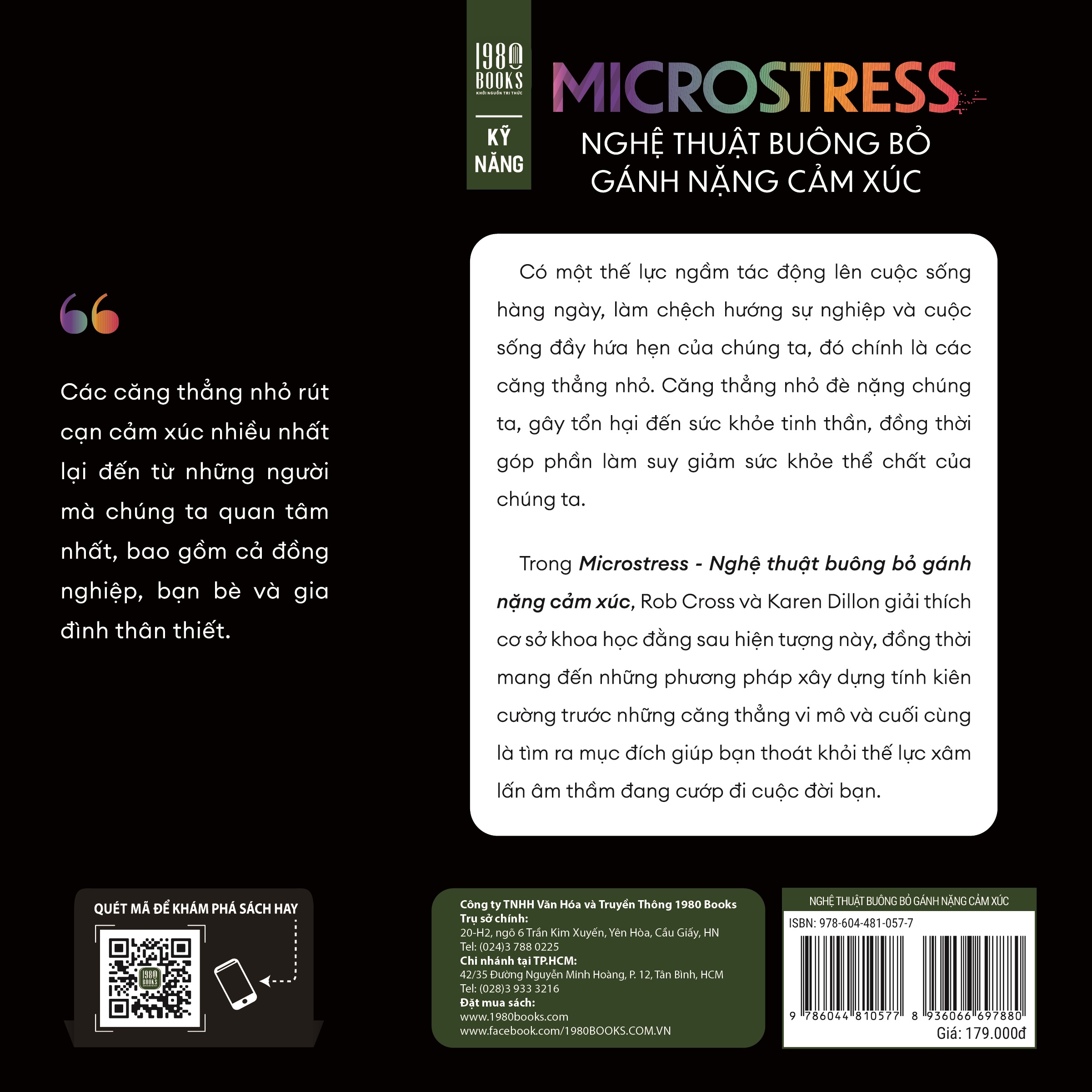 Trong Microstress – Nghệ thuật buông bỏ gánh nặng cảm xúc, Rob Cross và Karen Dillon giải thích những cơ sở khoa học đằng sau hiện tượng này, đồng thời mang đến những phương pháp xây dựng tính kiên cường trước những căng thẳng vi mô và cuối cùng là tìm ra mục đích giúp bạn thoát khỏi thế lực xâm lấn âm thầm đang cướp đi cuộc đời bạn.