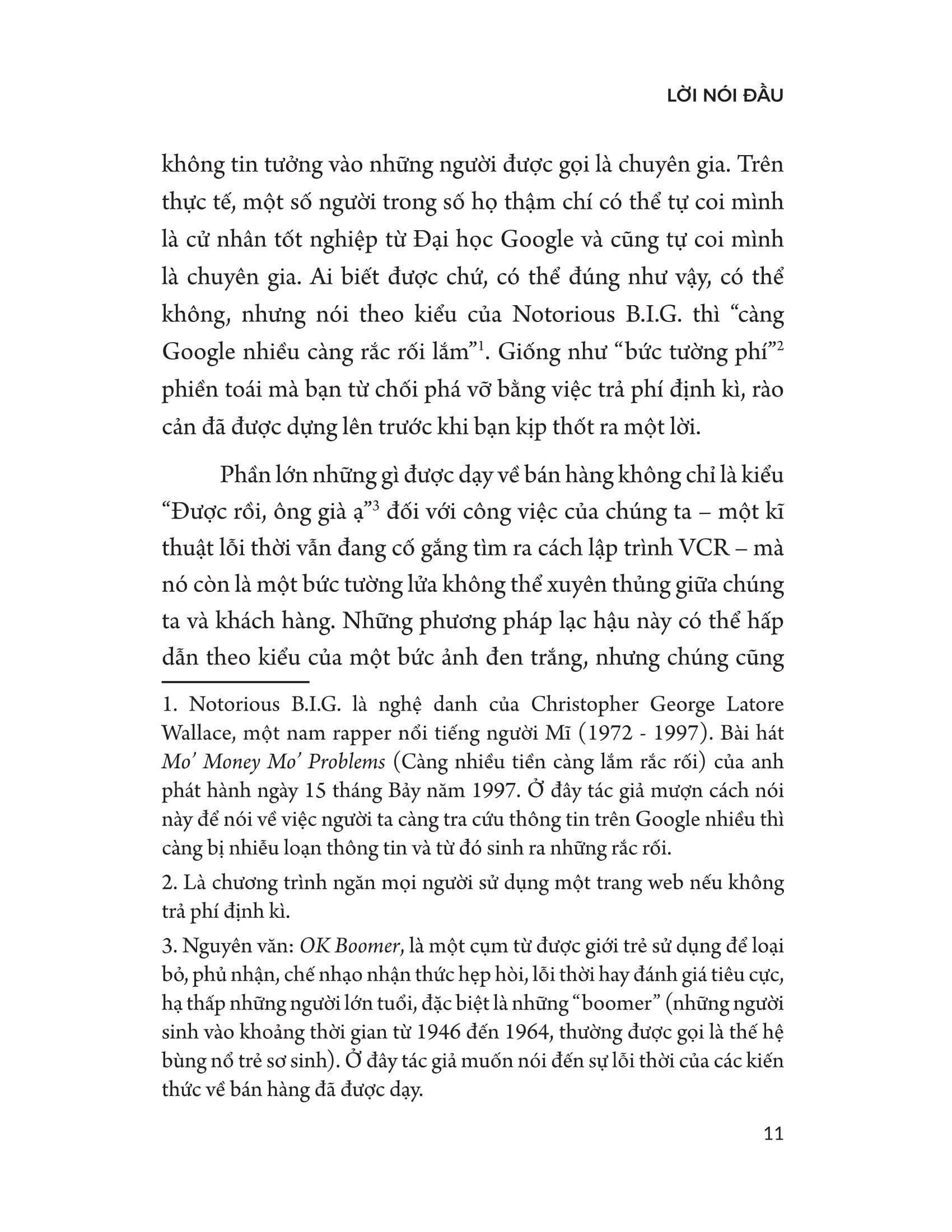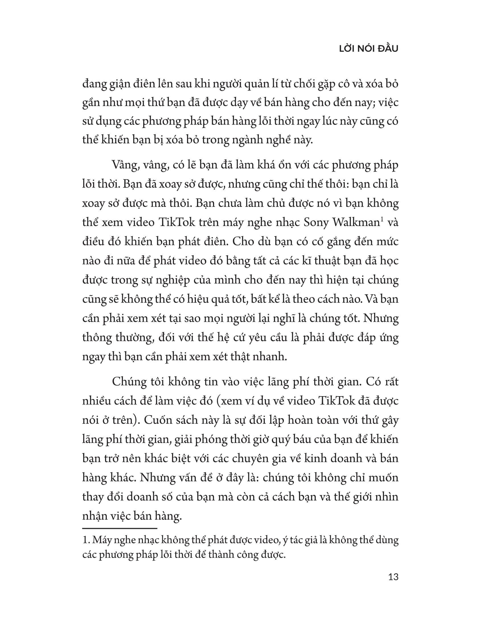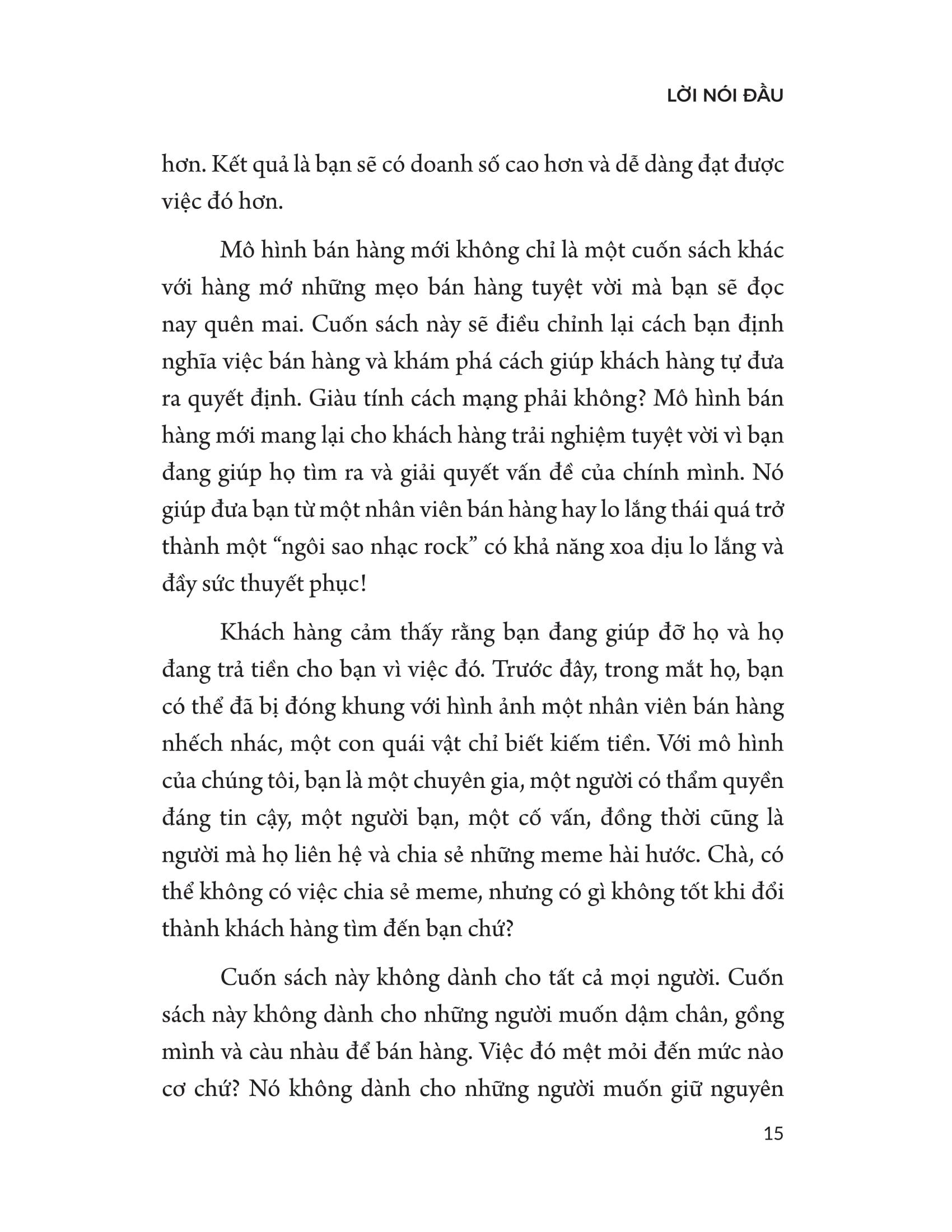 Cuốn sách này dành tặng cho vô số chuyên gia và lãnh đạo về bán hàng, những người không có lựa chọn nào khác ngoài việc học, chấp nhận và áp dụng các kĩ thuật bán hàng truyền thống được hình thành trong những kỉ nguyên bán hàng xưa cũ.
