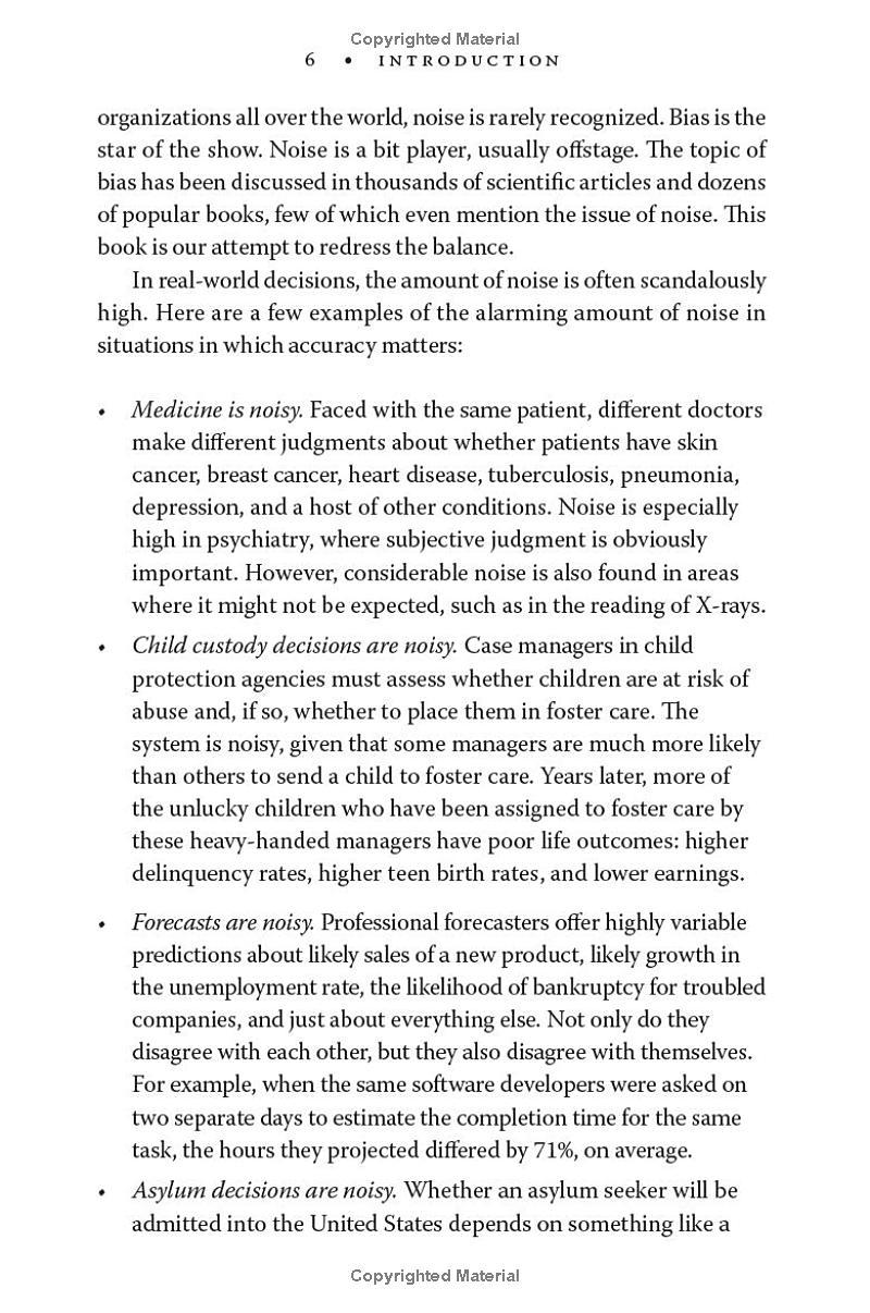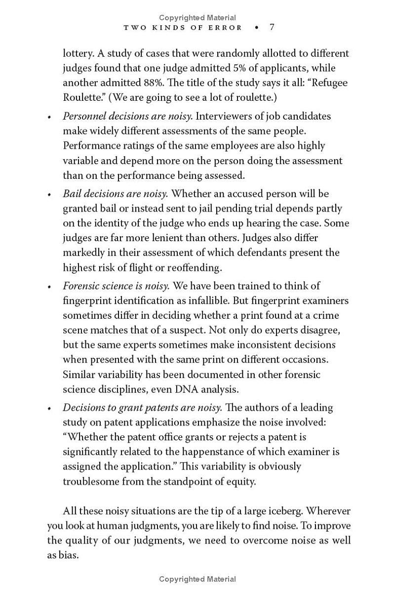Imagine that two doctors in the same city give different diagnoses to identical patients--or that two judges in the same courthouse give markedly different sentences to people who have committed the same crime. Suppose that different interviewers at the same firm make different decisions about indistinguishable job applicants--or that when a company is handling customer complaints, the resolution depends on who happens to answer the phone. Now imagine that the same doctor, the same judge, the same interviewer, or the same customer service agent makes different decisions depending on whether it is morning or afternoon, or Monday rather than Wednesday. These are examples of noise: variability in judgments that should be identical.