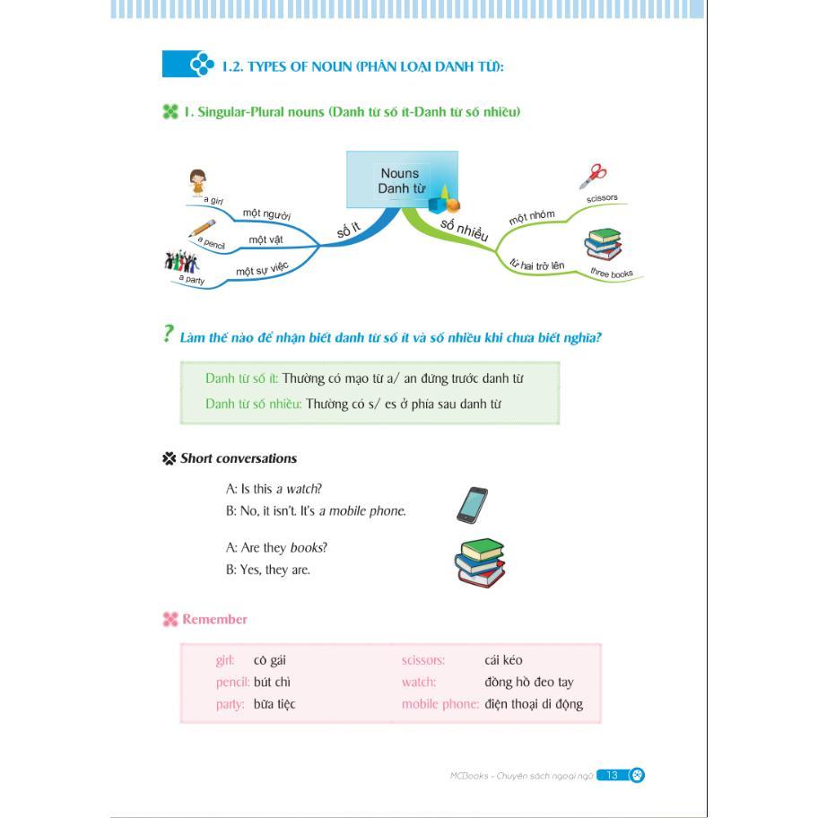 - Mindmap English Grammar - Ngữ Pháp Tiếng Anh Bằng Sơ Đồ Tư Duy Công ty phát hành MCBOOKS Tác giả Đỗ Nhung Nhà xuất bản Hồng Đức Năm xuất bản 2020 Số trang 335 Làm cách nào để nâng cao trình độ? Học thế nào để nhớ nhanh, ngấm lâu? Sơ đồ tư duy được mệnh danh là " CÔNG CỤ VẠN NĂNG CHO BỘ NÃO" - một phương pháp trình bày ý tưởng, kiến thức bằng những từ khóa chính, hình ảnh và màu sắc, giúp não bộ phát huy tối đa khả năng ghi nhớ. Phương pháp này hiện nay được hơn 250 triệu người trên thế giới sử dụng, đã và đang đem lại những hiệu quả thực sự nhất là ngữ pháp tiếng Anh bởi: Giúp bạn nắm được bức tranh toàn cảnh của chủ để nghiên cứu Phương pháp ghi nhớ tối ưu hiệu quả, tăng khả năng tập trung khi học Cải thiện khả năng khai thác chi tiết thông tin , giải quyết triệt để quá tải dữ liệu Cải thiện kỹ năng nghe qua các ví dụ hội thoại, tăng tính ứng dụng thực tế Đột phá tư duy qua các sơ đồ mindmap, các hình ảnh giúp bạn dễ dàng hình dung Kích thích sự phát triển của bộ não trong quá trình học, khơi dậy niềm đam mê học Giúp bạn tổ chức thông tin vào các nhánh dễ nhớ, nắm trọn ngữ pháp từ a đến z Gia tăng khả năng xử lý các vấn đề phức tạp, rút ngắn được thời gian học Mindmap English Grammar - Ngữ Pháp Tiếng Anh Bằng Sơ Đồ Tư Duy Bạn cũng biết rằng ngữ pháp tiếng Anh là nền tảng cho các kỹ năng nghe - nói -đọc -viết, nhưng lại thật khó nhớ vì ngữ pháp có quá nhiều kiến thức khô khan, cấu trúc cứng nhắc, giải thích dài dòng. Giờ đây với cuốn sách bạn đang cầm trên tay, bạn sẽ được trải nghiệm một phương pháp học ngữ pháp rất dễ dàng và thú vị. Toàn bộ kiến thức ngữ pháp được thiết kế dưới dạng sơ đồ tư duy Mind map kết hợp với hình ảnh sinh động, giải thích cách sử dụng qua những từ khóa chính giúp bạn ghi nhớ nhanh và hiệu quả hơn. Cuốn sách không chỉ giúp bạn chinh phục ngữ pháp tiếng anh cấp tốc mà còn giúp bạn phát triển khả năng tư duy sáng tạo. Hãy học tập và trải nghiệm! NOUN - Danh từ ARTICLE - Mạo từ PRONOUN - Đại từ TENSES - Thì PASSIVE VOICE - Câu bị động
