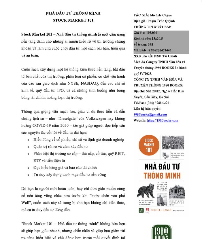 Giới thiệu ngắn: "Stock Market 101 – Nhà đầu tư thông minh" là cuốn sách nhập môn toàn diện, giúp người đọc hiểu rõ cách thị trường chứng khoán vận hành, từ đó đưa ra quyết định đầu tư bài bản và hiệu quả. Nội dung dễ hiểu, giàu ví dụ thực tiễn, phù hợp cho người mới bắt đầu hoặc người đang tìm kiếm tư duy đầu tư vững chắc. USP: