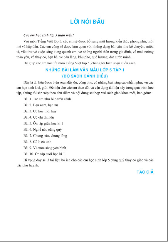 Để giúp các em học tốt môn Tiếng Việt lớp 5, chúng tôi biên soạn cuốn sách: NHỮNG BÀI LÀM VĂN MẪU LỚP 5 TẬP 1
