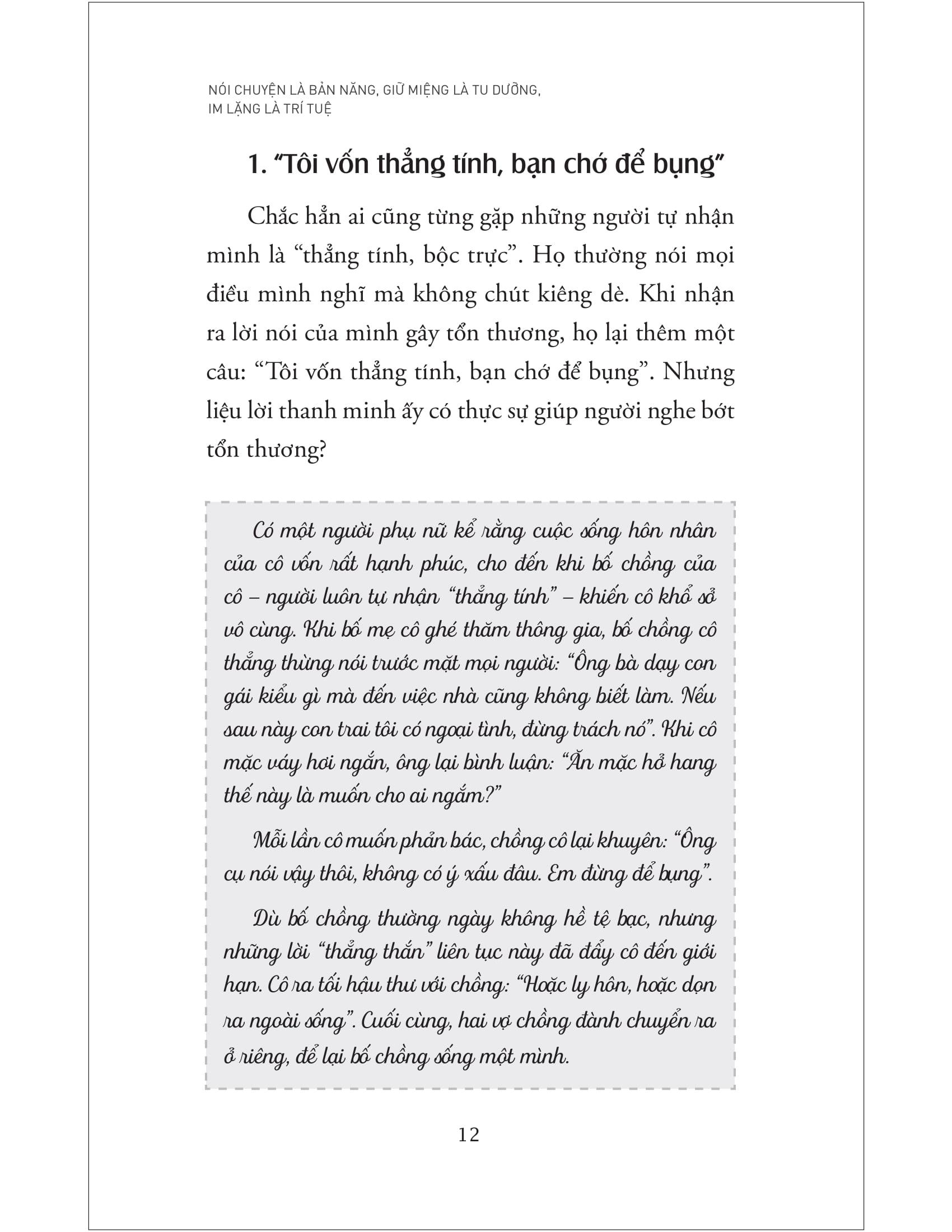 "Nói chuyện là bản năng, giữ miệng là tu dưỡng, im lặng là trí tuệ" không chỉ giúp bạn giao tiếp tốt hơn, mà còn hướng tới một phiên bản trưởng thành và lành mạnh hơn của chính m.ình – một người biết thấu hiểu, biết yêu thương và đủ mạnh mẽ để không làm tổn thương cũng như không để bị tổn thương.