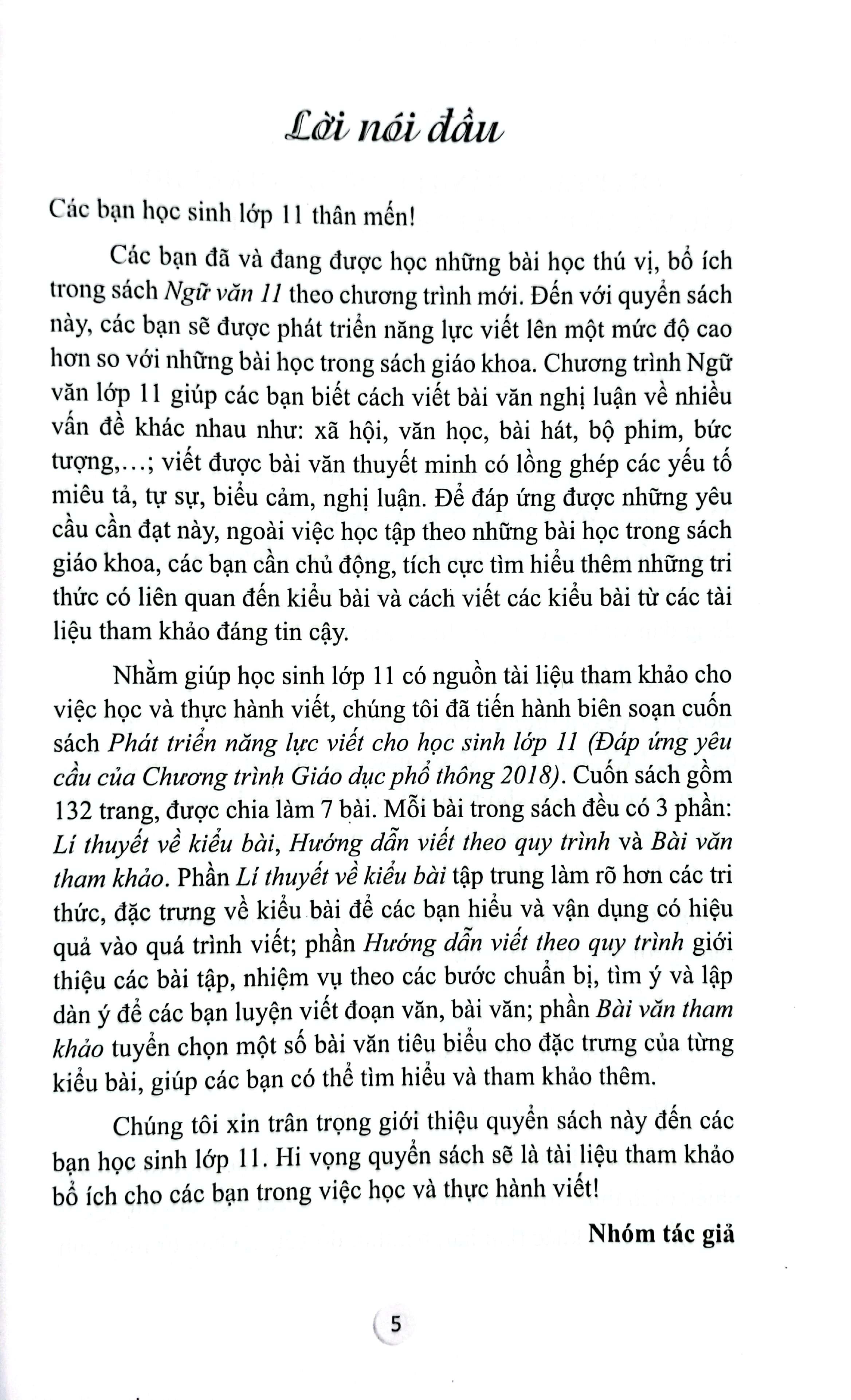 Nhằm giúp học sinh lớp 11 có nguồn tài liệu tham khảo cho việc học và thực hành viết, chúng tôi đã tiến hành biên soạn cuốn sách Phát triển năng lực viết cho học sinh lớp 11 (Đáp ứng yêu cầu của Chương trình Giáo dục phổ thông 2018). Cuốn sách gồm 132 trang, được chia làm 7 bài. Mỗi bài trong sách đều có 3 phần: Li thuyết về kiểu bài, Hướng dẫn viết theo quy trình và Bài văn tham khảo. Phần Lí thuyết về kiểu bài tập trung làm rõ hơn các tri thức, đặc trưng về kiểu bài để các bạn hiểu và vận dụng có hiệu quả vào quá trình viết; phần Hướng dẫn viết theo quy trình giới thiệu các bài tập, nhiệm vụ theo các bước chuẩn bị, tìm ý và lập dàn ý để các bạn luyện viết đoạn văn, bài văn; phần Bài văn tham khảo tuyển chọn một số bài văn tiêu biểu cho đặc trưng của từng kiểu bài, giúp các bạn có thể tìm hiểu và tham khảo thêm.
