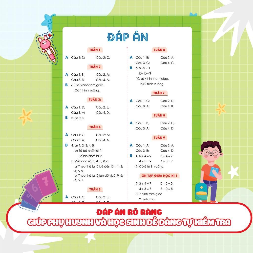 Mua tại TiktokCuối tuần không chỉ để nghỉ ngơi mà còn là thời gian thích hợp ôn tập lại kiến thức đã được học ở trường. Với mong muốn giúp các con nắm vững kiến thức trên lớp trong 35 tuần học, bộ sách Phiếu bài tập cuối tuần đã được biên soạn dành riêng cho học sinh tiểu học từ lớp 1 đến lớp 5 với bộ 3 cuốn: Phiếu bài tập cuối tuần Tiếng Việt, Phiếu bài tập cuối tuần Toán, Phiếu bài tập cuối tuần Tiếng Anh. Phiếu bài tập cuối tuần Toán 1 gồm các bài luyện tập chia theo tuần, ôn tập tổng quát kiến thức của 35 tuần học. Ngoài ra cuốn sách cũng cung cấp các bài kiểm tra giữa kỳ và cuối kỳ để các con trau dồi thêm, tự tin chinh phục điểm cao trong các bài kiểm tra trên lớp. Phiếu bài tập cuối tuần Toán 1 có những ưu điểm như sau: