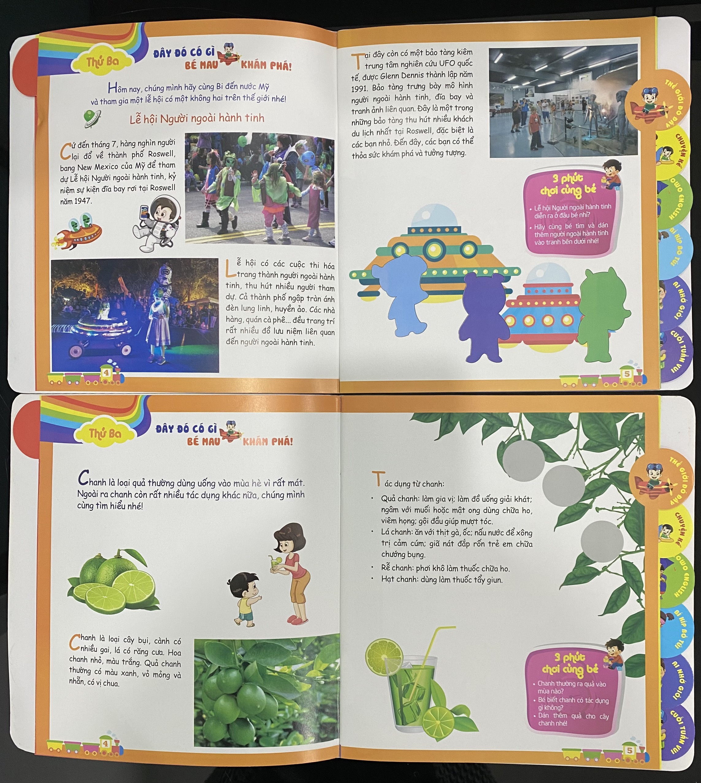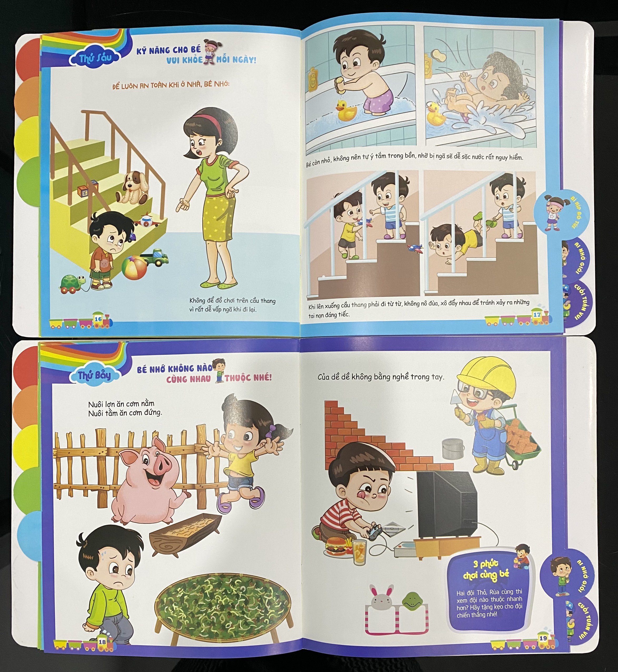 Bộ sách được biên soạn theo nội dung chương trình giáo dục dành cho lứa tuổi mầm non từ 3-6 tuổi. Nội dung mỗi cuốn được chia theo từng ngày trong tuần: 7 chuyên mục tương ứng với 7 ngày trong tuần, giúp trẻ không nhàm chán vì phụ huynh có thể tương tác cùng con các nội dung khác nhau mỗi ngày. Cụ thể nội dung mỗi ngày như sau: