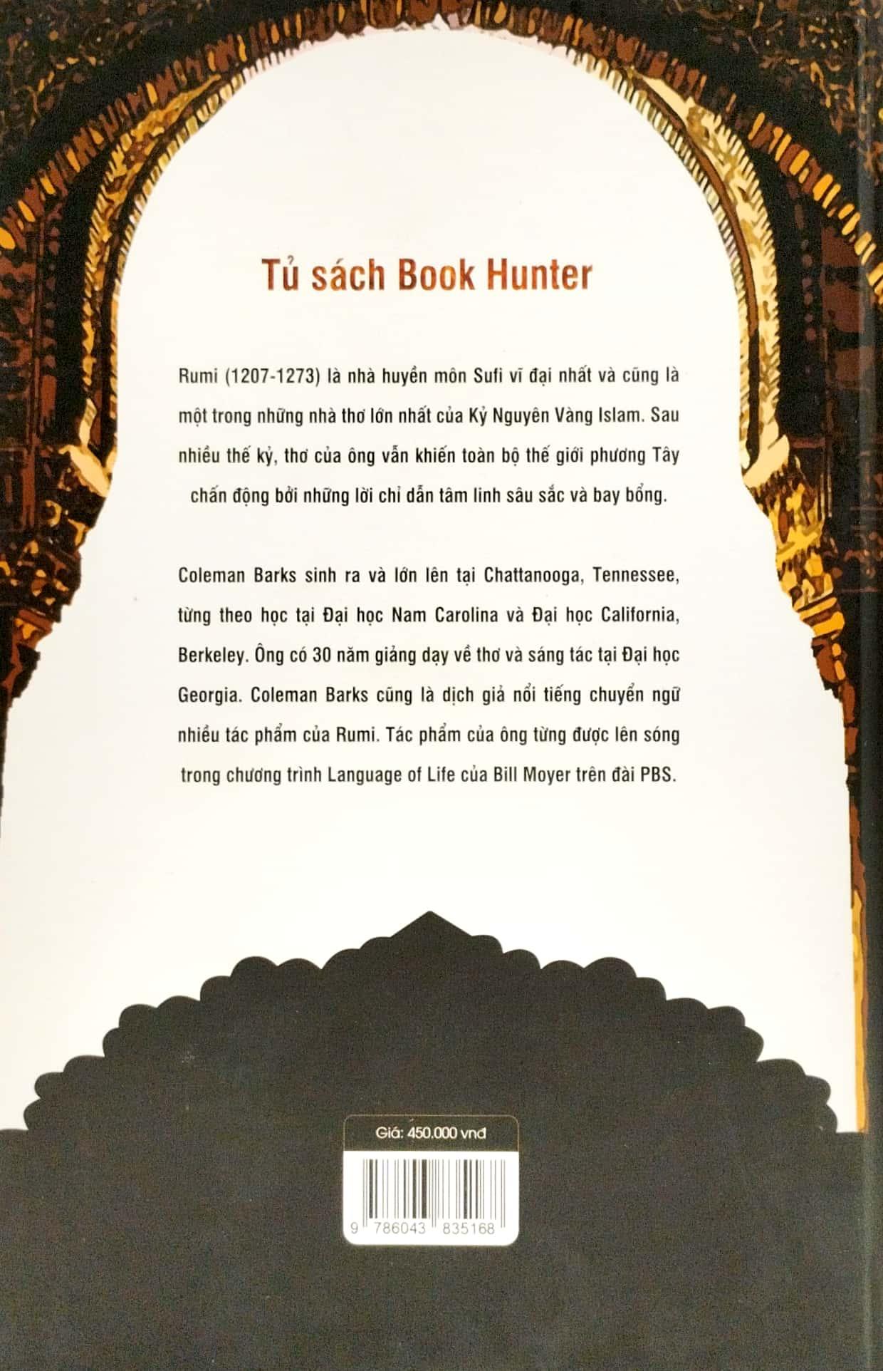 Rumi Tinh Tuyệt - Bìa Cứng Jalal-ud-din Rumi (1207-1273) là nhà thần bí đồng thời là nhà thơ vĩ đại nhất của thế giới Islam cổ đại. Ông là nhà thần bí quan trọng trong trường phái bí giáo Islam có tên là Sufi – trường phái tâm linh đạt được chứng nghiệm về Thượng Đế và toàn thể thông qua nhảy múa, âm nhạc và thơ ca. Rumi xuất hiện vào cuối Kỷ nguyên vàng Islam, kỷ nguyên của đỉnh cao văn hóa và khoa học tại Trung Đông. Ông thừa hưởng tinh thần tự do của rất nhiều các học giả đi trước đã ca tụng, kết hợp với tính thơ ca thiêng liêng trong kinh Koran. Do đó, các vần thơ của ông vừa đẹp đẽ lại vừa hướng thượng, vừa đắm đuối say mê lại vừa siêu thoát tựa loài phượng hoàng, vừa khoái lạc ở cõi trần tục lại vừa bay bổng ở cõi thiêng. Thơ Rumi được ghi chép lại rất nhiều và mỗi người ghi chép và dịch sang tiếng Anh lại tiếp cận đến một phần trong lời chỉ dẫn của ông. Coleman Barks tập hợp thơ Rumi và chia thành 27 chủ đề khác nhau. Tại sao lại là 27, đó dường như là một bí ẩn để giải mã. Coleman Barks úp mở về con số này, và cũng khẳng định rằng sự sắp xếp của ông “là để làm lú lẫn các học giả muốn phân tách thơ Rumi thành các chuyên mục đang được chấp nhận hiện nay”. Nhưng ở đây, tôi sẽ không giải mã con số 27. Chẳng tội gì sa đà vào giải mã một cái bẫy mà tác giả giăng ra để những kẻ thích giải mã rơi vào. Thay vì đó, tôi sẽ cố phân loại những ấn tượng của bản thân khi đọc “Rumi tinh tuyêt” và cố mô tả sự tuôn chảy, sự bùng cháy của tôi khi đọc tuyệt phẩm này. Đây vốn là một hành vi khá nghịch lý, bởi vì khi tôi ngồi viết những dòng này thì sự bùng cháy và sự tuôn chảy ấy đã qua rồi.