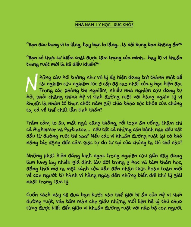 Cuốn sách này sẽ đưa bạn bước vào thế giới bí ẩn của hệ vi sinh đường ruột, vén tấm màn che giấu những mối liên hệ lý thú chưa từng được biết đến giữa vi khuẩn đường ruột với não bộ con người