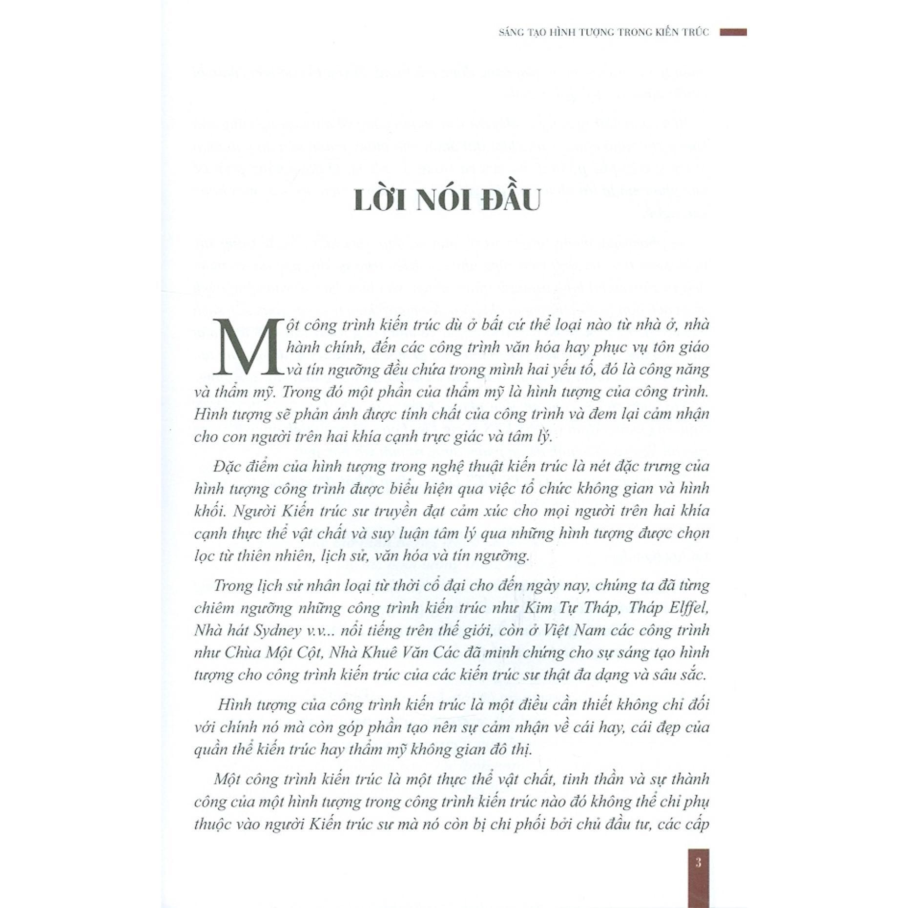 Ấn phẩm này muốn tạo cơ sở lý luận và thực tiễn làm tiền đề trong suy nghĩ, sáng tạo của sinh viên cũng như các Kiến trúc sư khi sáng tác và phân tích sự chuyển tải hình tượng từ thiên nhiên, văn hóa, lịch sử vào công trình một cách hợp lý. Với những ai chi phối đến người kiến trúc sư, qua cuốn sách này có thể hiểu thêm về quá trình thiết kế một công trình vừa đáp ứng nhu cầu sử dụng vừa đảm bảo yếu tố thẩm mĩ là một quá trình lao động sáng tạo và từ đó có sự đánh giá đúng vị trí của kiến trúc sư trong lĩnh vực xây dựng.