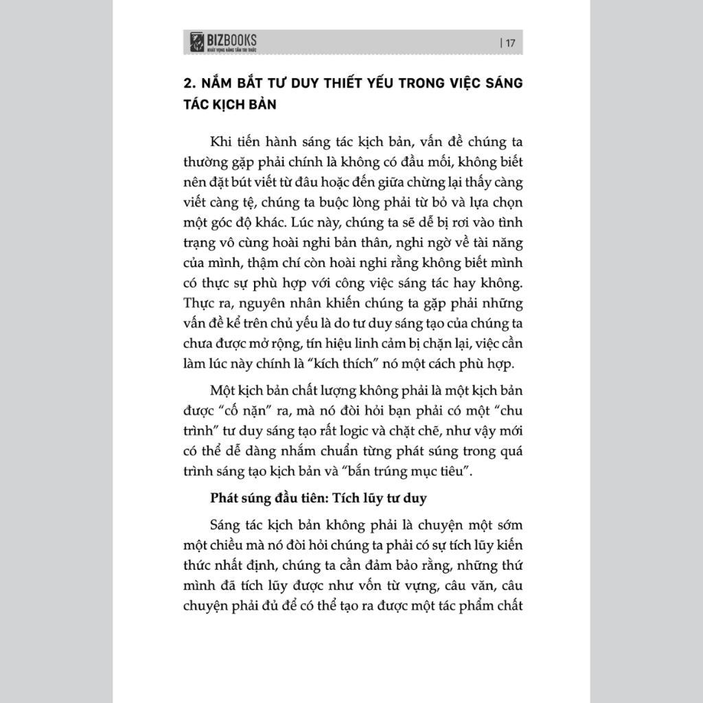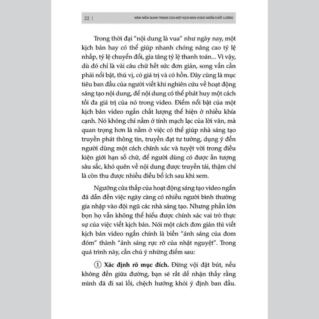 • Không lồng ghép quảng cáo quá lộ liễu, không để xuất hiện những watermark/logo không liên quan, đảm bảo chất lượng hình ảnh rõ nét và tránh những cảnh quay không nên xuất hiện. Các bước để xây dựng một kịch bản video ngắn triệu view: Trong cuốn sách “Short videos : Kịch bản hay, triệu views tới tay”, tác giả chia sẻ các bước chi tiết, những kinh nghiệm và phương pháp để có được một kịch bản hoàn hảo. Tư duy sáng tạo kịch bản: Đừng vội đặt bút vì chúng ta dễ đi sai, việc viết kịch bản đòi hỏi phải có tư duy phóng khoáng, tự do, không gò bó, cần biết cách điều khiển tư duy linh hoạt để nó luôn hữu ích. Bạn cần sở hữu cho mình một số tư duy như định vị, liên kết… trong sáng tạo nội dung để chạm đến điểm đau thật sự khi nói đến nhu cầu của người dùng. Tiêu đề: Tiêu đề là điểm bắt đầu, là đại diện cho sự độc đáo, tiêu đề giúp thu hút sự chú ý, sàng lọc người dùng, dẫn dắt tương tác, tăng tốc. Trong cuốn sách, tác giả sẽ chia sẻ phương pháp viết tiêu đề và mẹo để tạo ra một tiêu đề bùng nổ. Mở đầu của kịch bản video: Việc kiểm soát thời gian là điều cốt yếu và ba giây đầu là thời điểm quan trọng, gọi là “3 giây vàng”. Ba giây này quyết định phần lớn số lượng người dùng mà một video có thể thu hút và giữ chân. Phần chính của video: Phần chính của video chính là yếu tố cốt lõi để khơi gợi sự cộng hưởng ở người dùng và được người dùng ghi nhớ, đem lại cho họ sự cộng hưởng cảm xúc, tác động các giá trị quan hoặc gợi hành động, suy nghĩ sâu sắc. Cuốn sách mang đến cách để video trở nên đáng nhớ. Phần kết: Phần kết là phần để biến lượng truy cập thành lượt chuyển đổi. Một phần kết không chỉ thỏa mãn người dùng, mang tới lượt yêu thích, chia sẻ bình luận mà còn lôi kéo được mọi người đến trang chủ của nhà sáng tạo, tăng lượt theo dõi và bán được hàng. Ngoài ra, trong cuốn sách “Short videos: Kịch bản hay, triệu view tới tay” tác giả còn chia sẻ cách để có được những câu vàng, làm điểm nhấn cho video hoặc mẹo viết kịch bản cho từng nền tảng mạng xã hội thường gặp, những lỗi thường có khi viết kịch bản video ngắn. Theo xu hướng thời đại, video ngắn trở thành một công cụ đắc lực cho các nhà sáng tạo nội dung, nếu nắm trong tay những kiến thức và điểm mấu chốt, nó sẽ giúp cho bạn đạt được điều mình muốn. Áp dụng những nội dung trong cuốn sách Short videos: Kịch bản hay, triệu view tới tay để có được video triệu view ngay bây giờ! Thông tin chi tiết cuốn sách Short Videos: Kịch Bản Hay, Triệu Views Tới Tay - Cách Để Có Một Video Ngắn Bùng Nổ Và Độ Chuyển Đổi Cao