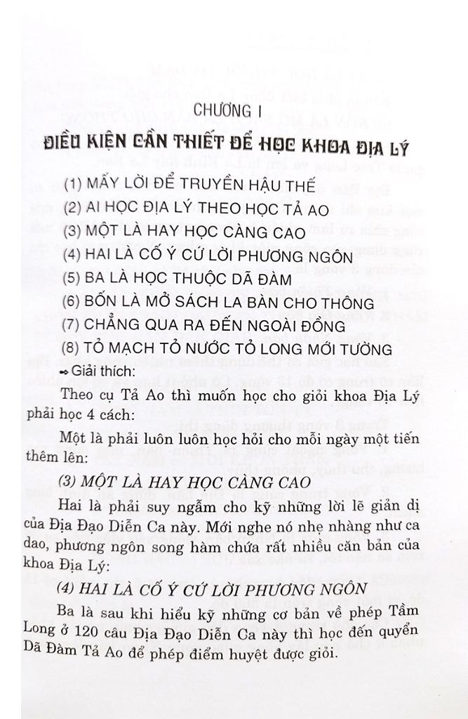 Sách Địa lý Tả Ao được viết từ căn bản đến chi tiết, rất súc tích nhưng dễ học, dễ hiểu. Từ lúc sinh thời, cụ đã được người đời tôn là Thánh Địa lý Tả Ao. Cụ là người Việt Nam đầu tiên đi học khoa Địa lý tận nơi khai sáng khoa này là Trung Hoa và cụ cũng là người Việt Nam đầu tiên viết sách Địa lý còn truyền đến ngày nay.