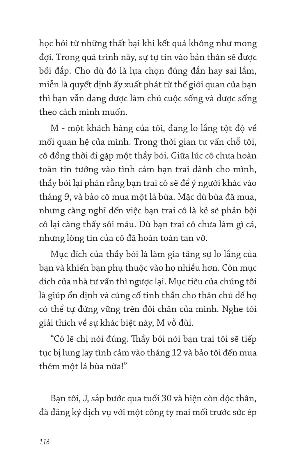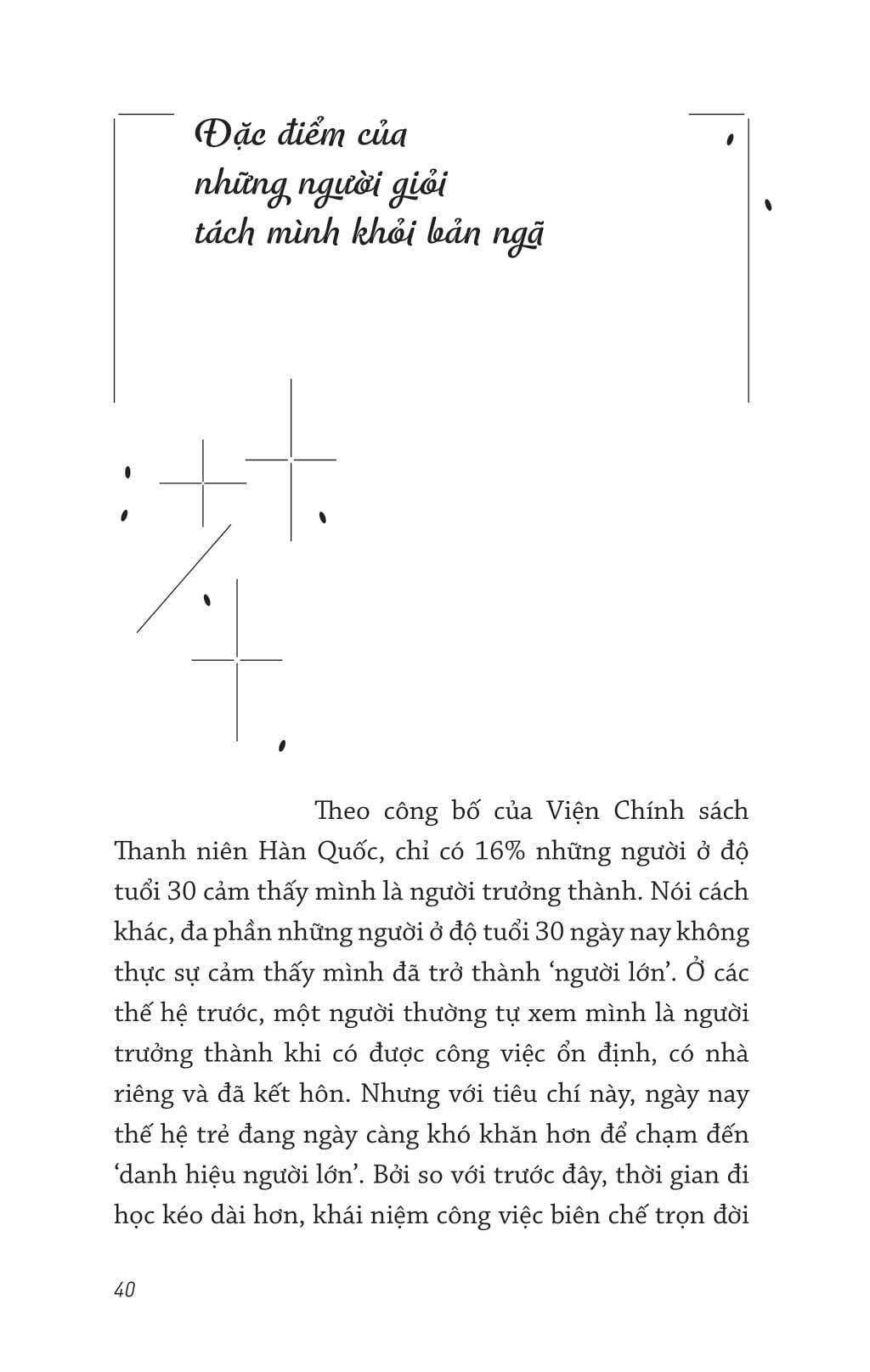 Tuổi 30 ngày nay không còn giống tuổi 30 ngày xưa. Đến tuổi này, nếu bạn vẫn chưa ổn định về kinh tế hay về tinh thần thì bạn sẽ vẫn như thuở 20, đầy hoang mang và mơ hồ trước cuộc đời. Tác giả cũng từng trải qua giai đoạn cô đơn và lạc lối như thế. Nhưng nhờ được học ngành tâm lý học mà cô hiểu được nguyên nhân khiến tâm trí bấn loạn không đến từ môi trường bên ngoài hay từ những người xung quanh, mà chính là do cảm giác xa lạ với chính m.ình. Chỉ sau khi cô đọc vị những cảm xúc ẩn giấu sâu bên trong và gần gũi hơn với nội tâm thì cô mới cải thiện được mối quan hệ với bản thân, với người khác, và thậm chí cả công việc m.ình đang làm.