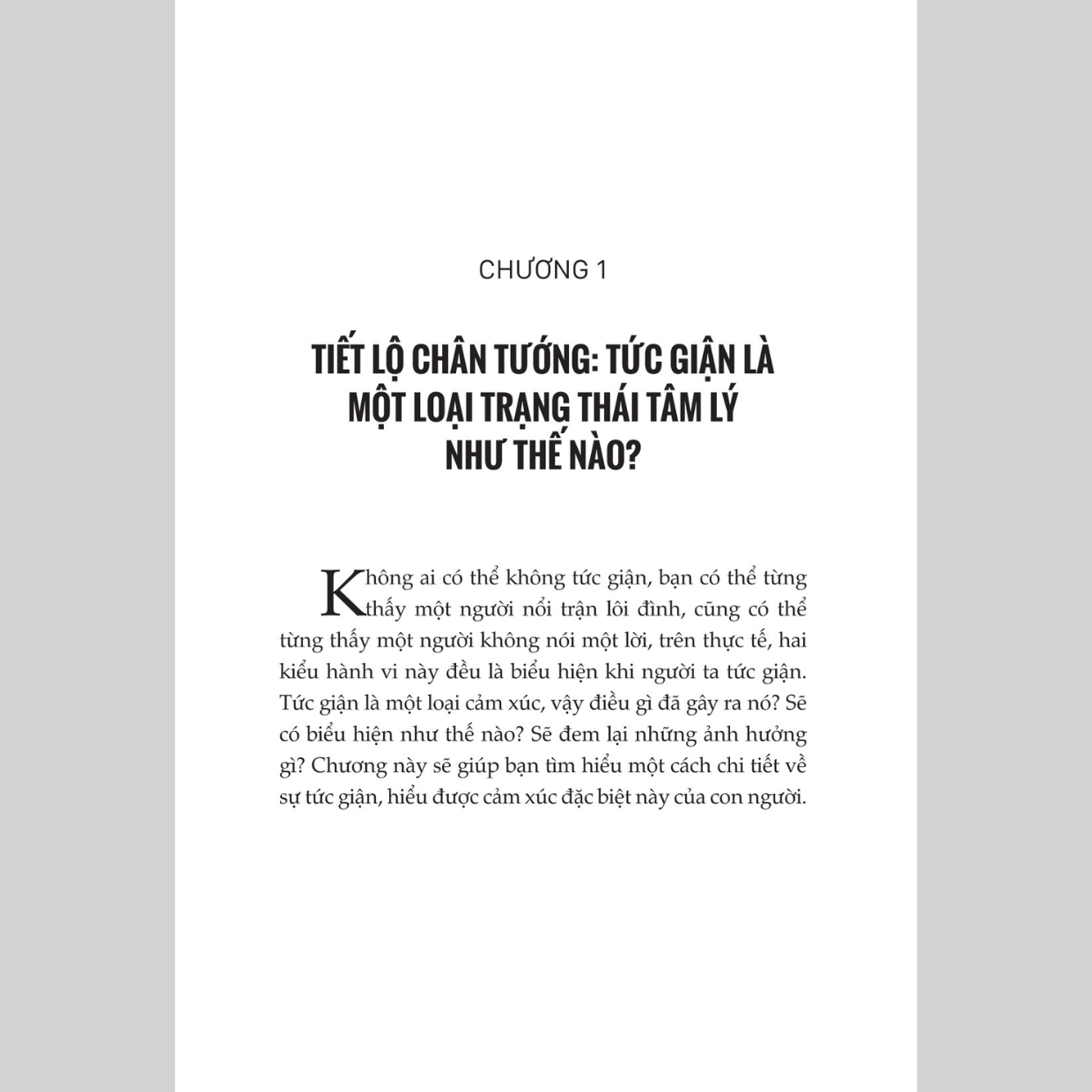 Cuốn sách này bắt đầu bằng việc tiết lộ chân tướng của sự tức giận, cho chúng ta biết ý nghĩa, nguyên nhân và hậu quả của sự tức giận, tiếp theo sẽ phân tích chi tiết 7 loại tức giận thường gặp trong cuộc sống và cách đối phó với chúng. Cuối cùng, hai chương còn lại để thảo luận cho câu hỏi làm thế nào để thay đổi phương thức tư duy méo mó của bản thân, xây dựng lại phương thức quản lý nội tâm, biến cơn tức giận thành vô hình, từ đó để nội tâm đạt được sự ổn định, tự tin và sức mạnh.