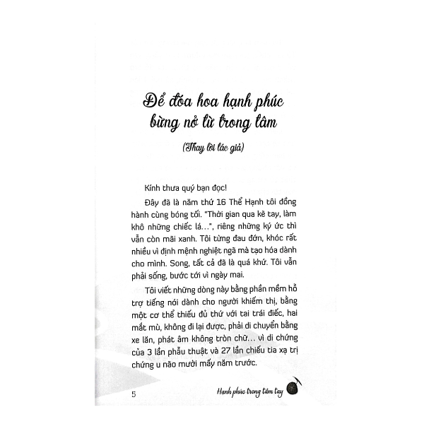 Thông tin chi tiết Mã hàng 9786044725406 Tên Nhà Cung Cấp Phụ Nữ Tác giả Lê Dương Thể Hạnh NXB Phụ Nữ Việt Nam Năm XB 2023 Trọng lượng (gr) 205 Kích Thước Bao Bì 21 x 13 x 1 cm Số trang 209 Hình thức Bìa Mềm   Mô tả sản phẩm Hạnh Phúc Trong Tầm Tay - Lê Dương Thể Hạnh   Hạnh phúc trong tầm tay của tác giả Lê Dương Thể Hạnh thuộc dòng sách bổ trợ kỹ năng sống, là "rút ruột" chia sẻ từ tác giả về những đức tính quý báu mà con người cần có trong đời để cuộc sống trở nên chất lượng, trọn vẹn hơn.   Là một tác giả khuyết tật, viết sách bằng phần mềm hỗ trợ giọng nói và nhờ sự giúp đỡ của cộng sự, Lê Dương Thể Hạnh cho thấy một nghị lực phi thường trong việc gieo những con chữ thiện lương, được trau chuốt cẩn thận để giúp vun bồi tâm hồn những bạn đọc "thuận duyên" đọc sách.   Đồng hành cùng bóng tối hơn 15 năm, hơn ai hết, tác giả thấu hiểu việc "vượt tối" để tìm đến ánh sáng lương thiện trong "cõi người ta" này vô cùng gian nan. Và với những người thuộc nhóm "còn lại" như chính bản thân tác giả - khuyết tật đủ thứ, khả năng di chuyển và hoạt động hạn chế - hành trình "vượt tối" còn gian nan hơn gấp nhiều lần. Tuy vậy, chị không bỏ cuộc.   Ở độ tuổi mà mọi người đã yên bề gia thất, con cái lớn khôn, tác giả Lê Dương Thể Hạnh, như bộc bạch của chị trong các trang sách, vẫn vui vẻ bên gia đình, cha mẹ, vẫn tận hưởng cuộc sống theo cách của riêng mình, và để biết rằng, ngày nào còn thở trên cuộc đời này thôi đã là may mắn lắm rồi. Nhưng những điều mà chị muốn độc giả hướng đến không dừng lại ở đó.   Chị tâm sự: "Đến với Hạnh phúc trong tầm tay, có lẽ bạn sẽ tạm quên đi những nỗi đau ở quá khứ, và bạn cũng xa rời gánh nặng áo cơm để trở về với những giá trị - rất bình dị và rất chân thật từ trong sâu thẳm tâm hồn mình". Các chủ đề mà tác giả Lê Dương Thể Hạnh xoáy sâu vào gồm có bình yên, bao dung, khiêm tốn, yêu thương, lễ - nghĩa - trí - tín, tương trợ, tự do và hạnh phúc. Tuy xa mà gần, tuy gần mà xa, chị dẫn dắt độc giả qua từng chủ đề một cách dí dỏm, lối dẫn chuyện có duyên, văn phong khúc chiết để thấy được rằng, hạnh phúc không ở đâu xa mà nằm trong lòng bàn tay ta! Chị bộc bạch: "… Khi may mắn được sinh ra với cơ thể và trí não của một con người, có lẽ ta nên kích hoạt sóng não dành cho con người, vượt qua những nỗi sợ, mạnh dạn tiến về phía trước để đón nhận một tương lai tốt đẹp và thanh thản lưu lại những điều kỳ diệu cho cuộc đời. Và đây chính là tinh thần cốt lõi của Hạnh Phúc Trong Tầm Tay .