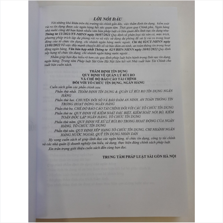 - Văn bản hợp nhất Thông tư 02/VBHN-NHNN ngày 10/01/2022Quy định xếp hạng tổ chức tín dụng, chi nhánh ngân hàng nước ngoài… ...//... Nội dung sách gồm 6 phần sau: Phần thứ nhất. THẨM ĐỊNH TÍN DỤNG & QUẢN LÝ RỦI RO TÍN DỤNG NGÂN HÀNG Phần thứ hai. CHUYỂN ĐỔI SỐ VÀ BẢO ĐẢM AN NINH, AN TOÀN THÔNG TIN TRONG HOẠT ĐỘNG NGÂN HÀNG Phần thứ ba. CHẾ ĐỘ BÁO CÁO TÀI CHÍNH ĐỐI VỚI CÁC TỔ CHỨC TÍN DỤNG Phần thứ tư. QUY ĐỊNH VỀ KIỂM SOÁT ĐẶC BIỆT, KIỂM SOÁT NỘI BỘ,KIỂM TOÁN ĐỘC LẬP NGÂN HÀNG, TỔ CHỨC TÍN DỤNG Phần thứ năm. QUY ĐỊNH VỀ XỬ LÝ RỦI RO TRONG HOẠT ĐỘNG CỦA NGÂN HÀNG, TỔ CHỨC TÍN DỤNG Phần thứ sáu. QUY ĐỊNH XẾP HẠNG TỔ CHỨC TÍN DỤNG, CHI NHÁNH NGÂN HÀNG NƯỚC NGOÀI, QUỸ TÍN DỤNG NHÂN DÂN ...//... Cảm ơn các bạn đã ghé thăm shop Nhà sách Nam Việt rất nhiều ạ! Thẩm Định Tín Dụng Quy Định Về Quản Lý Rủi Ro Và Chế Độ Báo Cáo Tài Chính Đối Với Tổ Chức Tín Dụng Ngân Hàng Sách Thẩm Định Tín Dụng Quy Định Về Quản Lý Rủi Ro Và Chế Độ Báo Cáo Tài Chính Đối Với Tổ Chức Tín Dụng Ngân Hàng