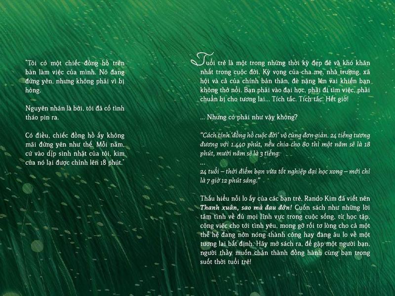 Tác giả Rando Kim Người Dịch Nguyễn Việt Tú Anh Nhà Xuất Bản: Hà Nội Năm Xuất Bản 2024 Kích Thước Bao Bì 20.5 x 14 cm Số trang 340 Hình thức Bìa Mềm Thanh Xuân, Sao Mà Đau Đớn! Tuổi trẻ là một trong những thời kỳ đẹp đẽ và khó khăn nhất trong cuộc đời. Kỳ vọng của cha mẹ, nhà trường, xã hội và cả của chính bản thân, đè nặng lên vai khiến bạn không thở nổi. Bạn phải vào đại học, phải đi tìm việc, phải chuẩn bị cho tương lai... Tích tắc. Tích tắc. Hết giờ! ... Nhưng có phải như vậy không? “Cách tính ‘đồng hồ cuộc đời’ vô cùng đơn giản. 24 tiếng tương đương với 1.440 phút, nếu chia cho 80 thì một năm sẽ là 18 phút, mười năm sẽ là 3 tiếng. ... 24 tuổi – thời điểm bạn vừa tốt nghiệp đại học xong – mới chỉ là 7 giờ 12 phút sáng.” Thấu hiểu nỗi lo ấy của các bạn trẻ, Rando Kim đã viết nên Có thanh xuân nào không đau đớn, có tuổi trẻ nào không bão giông. Cuốn sách như những lời tâm tình về đủ mọi lĩnh vực trong cuộc sống, từ học tập, công việc cho tới tình yêu, mong gỡ rối tơ lòng cho cả một thế hệ đang nôn nóng thành công hay đang âu lo về một tương lai bất định hay. Hãy mở sách ra, để gặp một người bạn, người thầy muốn chân thành đồng hành cùng bạn trong suốt thời tuổi trẻ!