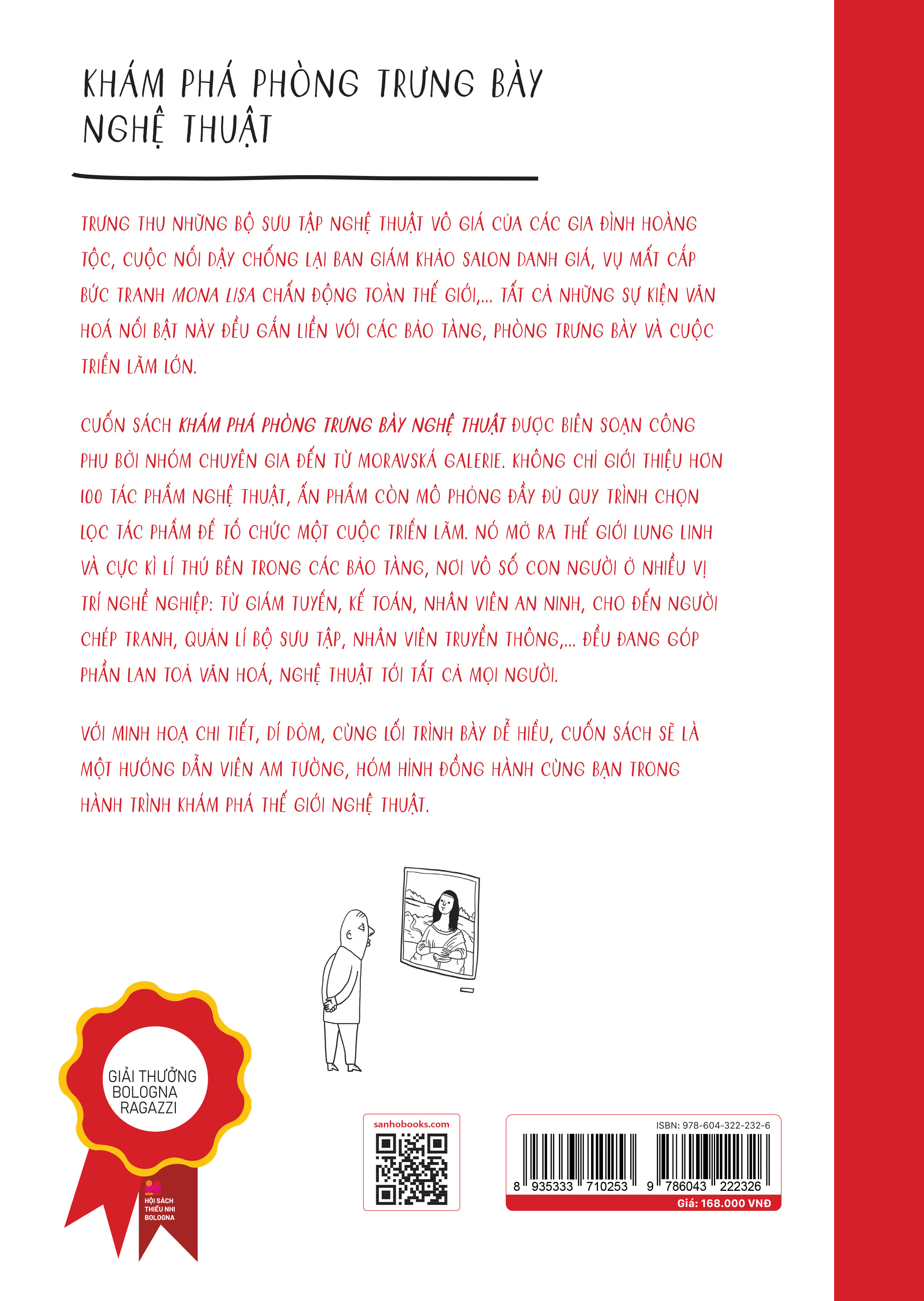 Cuốn sách Khám phá phòng trưng bày nghệ thuật được biên soạn công phu bởi nhóm chuyên gia đến từ Moravská Galerie. Không chỉ giới thiệu hơn 100 tác phẩm nghệ thuật, ấn phẩm còn mô phỏng đầy đủ quy trình chọn lọc tác phẩm để tổ chức một cuộc triển lãm. Nó mở ra thế giới lung linh và cực kì lí thú bên trong các bảo tàng, nơi vô số con người ở nhiều vị trí nghề nghiệp: từ giám tuyển, kế toán, nhân viên an ninh, cho đến người chép tranh, quản lí bộ sưu tập, nhân viên truyền thông, đều đang góp phần lan toả văn hoá, nghệ thuật tới tất cả mọi người.