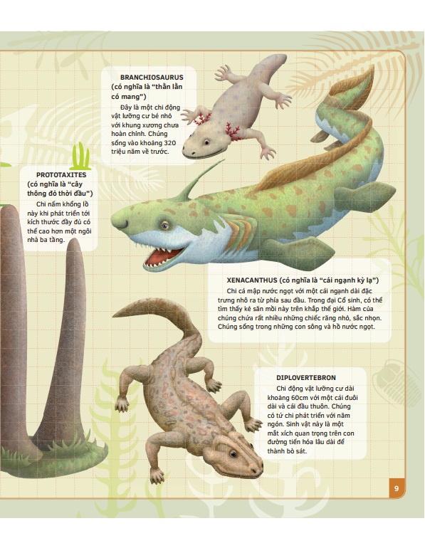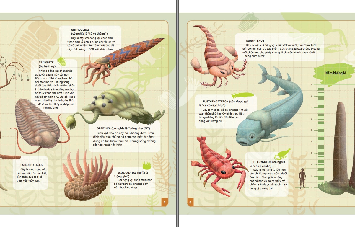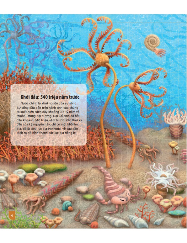 Từ các loài tảo và bọ ba thùy xuất hiện 540 triệu năm trước, cho đến những loài động vật xuất hiện vào khoảng 2,6 triệu năm trước như hươu khổng lồ, voi ma mút, hay tổ tiên quan trọng của con người. Qua mỗi mốc thời gian trên dòng thời gian của cuốn sách, bạn sẽ thu được vô số những điều lý thú cho riêng mình.