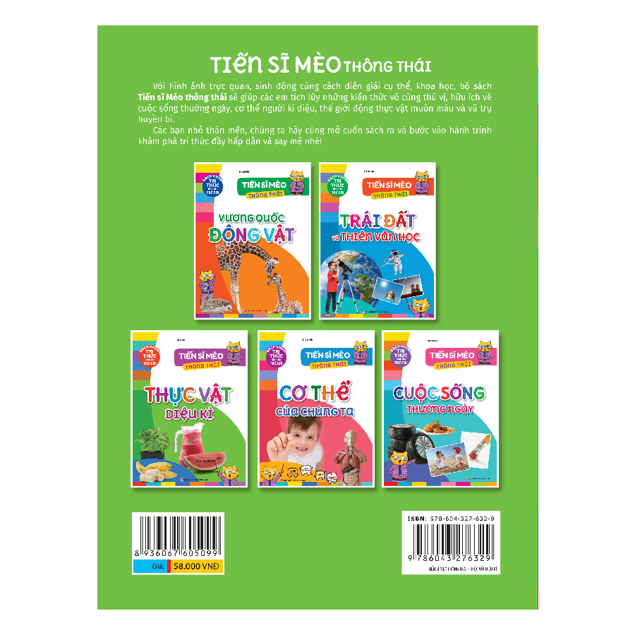 Với hình ảnh trực quan, sinh động cùng cách diễn giải cụ thể, khoa học, bộ sách Tiến sĩ Mèo thông thái sẽ giúp các em tích lũy những kiến thức vô cùng thú vị, hữu ích về cuộc sống thường ngày, cơ thể người kì diệu, thế giới động thực vật muôn màu và vũ trụ huyền bí.