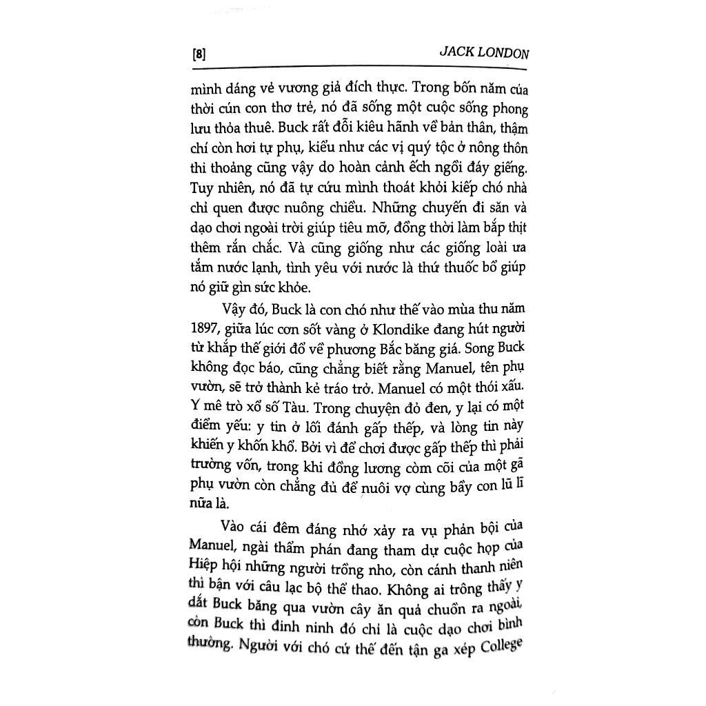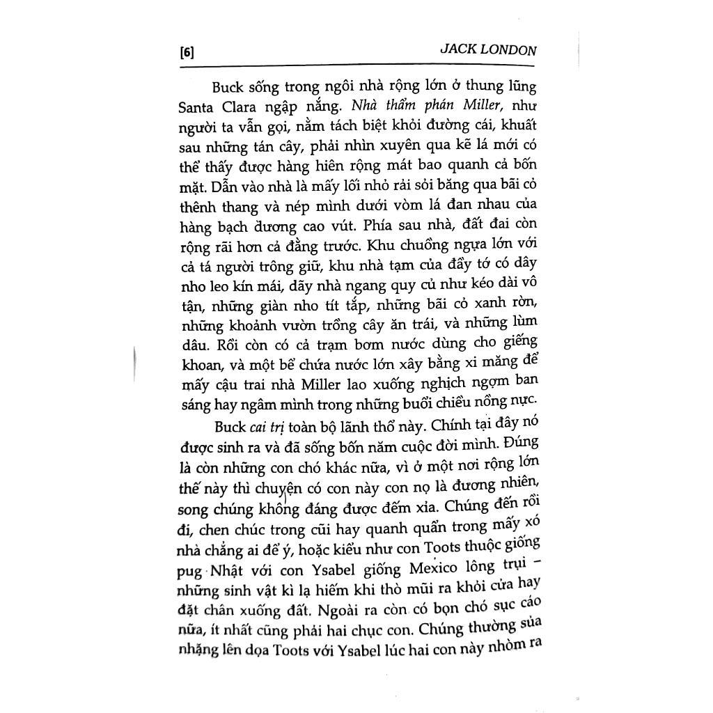 Mua tại TiktokTiếng Gọi Nơi Hoang Dã Tiếng Gọi Nơi Hoang Dã (nguyên bản tiếng Anh: The Call of the Wild) là tiểu thuyết của nhà văn Mỹ Jack London. Chuyện kể về những chuyến phiêu lưu mạo hiểm của chú chó Bấc trung thành. Bấc đang sống trong trang trại của một gia đình giàu có thì bị bắt cóc, trở thành chó kéo xe cho những người đi tìm vàng ở khu Alaska lạnh giá. Bấc phải học cách đối diện với cuộc đấu tranh sinh tồn và trở thành thủ lĩnh của đàn chó. Thiên nhiên nguyên thủy đã đánh thức bản năng của Bấc. Sau một lần đi săn trở về, Bấc nhìn thấy cái chết thương tâm của Thoóctơn - người chủ nó thương yêu nhất. Tình yêu thương, sự trung thành mà Bấc dành cho Thoóctơn trở thành nỗi đau thống thiết, Bấc trở nên hoang dã hơn bao giờ hết… Không còn mối liên hệ nào níu Bấc lại với con người, nó bị cuốn theo tiếng gọi nơi hoang dã, cuối cùng trở thành một con sói hoang. Xuất bản lần đầu năm 19, Tiếng Gọi Nơi Hoang Dã đã trở thành kiệt tác cuốn hút biết bao thế hệ người đọc. Đọc Tiếng Gọi Nơi Hoang Dã, bạn đọc sẽ cùng Bấc phiêu lưu tới những miền đất hoang sơ chưa ai biết, hiểu thế nào là lao khổ, tình yêu thương, sự trung thành và khát vọng tự do…