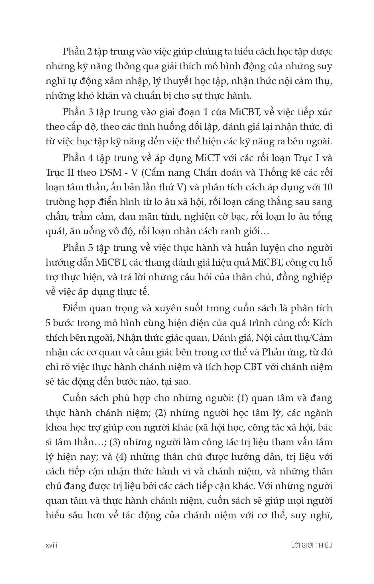Trị Liệu Nhận Thức Hành Vi Tích Hợp Chánh Niệm - Nguyên Tắc và Thực Hành Trong tâm lý học hiện đại, CBT (Cognitive Behavioral Therapy - Liệu pháp Nhận thức Hành vi) là một trong những phương pháp trị liệu hiệu quả và phổ biến. Phương pháp CBT dựa trên giả định rằng cảm xúc và hành vi tiêu cực phần lớn bắt nguồn từ cách chúng ta suy nghĩ về sự việc, chứ không phải hoàn toàn do hoàn cảnh bên ngoài. Do đó, mục tiêu chính của CBT là giúp thân chủ nhận ra và thay đổi những suy nghĩ sai lệch, từ đó điều chỉnh cảm xúc và hành vi theo hướng tích cực. CBT là một phương pháp linh hoạt, có thể kết hợp với nhiều kỹ thuật trị liệu khác để tăng hiệu quả. Một trong những hướng kết hợp nổi bật là với Chánh niệm (Mindfulness) - một khái niệm có nguồn gốc từ Phật giáo, nay đã được ứng dụng trong tâm lý học lâm sàng như một kỹ thuật mang tính khoa học. Chánh niệm giúp người thực hành rèn luyện khả năng quan sát nội tâm, tiếp xúc trực tiếp với cảm xúc thay vì né tránh hay phản ứng theo thói quen. Từ sự kết hợp này, MiCBT (Mindfulness-integrated Cognitive Behavioral Therapy - Liệu pháp Nhận thức Hành vi tích hợp Chánh niệm) ra đời. Phương pháp này được phát triển bởi Tiến sĩ Bruno Cayoun, một nhà trị liệu, cũng là người thực hành chánh niệm, với trên 22 năm kinh nghiệm trị liệu, giảng dạy, điều hành viện MiCBT và có kinh nghiệm nghiên cứu tại đại học Tasmania, Úc. Ông xây dựng MiCBT như một mô hình trị liệu có cấu trúc rõ ràng, hướng đến đ.iều trị các rối loạn như lo âu, trầm cảm, OCD, rối loạn lo âu xã hội và các khó khăn về điều tiết cảm xúc. Điểm đặc biệt là, MiCBT không mang màu sắc tôn giáo, dù sử dụng kỹ thuật thực hành Chánh niệm có nguồn gốc từ Phật giáo.Các kỹ thuật được điều chỉnh phù hợp với bối cảnh trị liệu hiện đại, dựa trên bằng chứng thực nghiệm. Chánh niệm trong MiCBT không chỉ giúp người học “nghĩ khác đi” như trong CBT, mà còn “trải nghiệm khác đi” - chấp nhận cảm xúc khó chịu một cách tỉnh thức thay vì né tránh. Từ nền tảng đó, cuốn sách Trị liệu Nhận thức Hành vi Tích hợp Chánh niệm: Nguyên tắc và Thực hành ra đời như một hướng dẫn toàn diện cho các nhà trị liệu, giảng viên và cả những người thực hành quan tâm đến MiCBT. Sách không chỉ trình bày lý thuyết một cách rõ ràng mà còn cung cấp hướng dẫn cụ thể từng bước để ứng dụng trong thực tế lâm sàng. Nội dung sách được chia thành 5 phần chính: