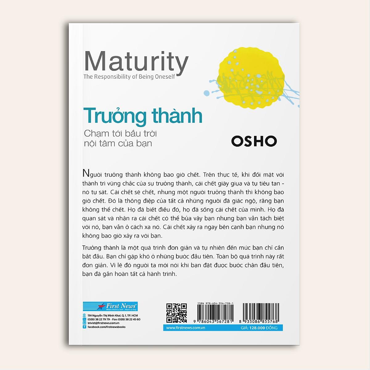 - Sẽ thế nào nếu theo năm tháng, bạn trưởng thành chứ không phải già đi? - Đa số chúng ta đều lớn lên trong một nền văn hóa theo đuổi sự trẻ trung và tìm cách trì hoãn tuổi già bằng mọi giá. Nhưng có bao giờ bạn tự hỏi chúng ta sẽ thế nào nếu thản nhiên đón nhận quá trình lão hóa của mình thay vì tìm cách níu kéo tuổi trẻ? Osho, một trong những bậc thầy tâm linh vĩ đại nhất của thế kỷ 20, giúp chúng ta giải đáp vấn đề này qua cuốn sách “Trưởng thành - Chạm tới bầu trời nội tâm của bạn”. Ai trong chúng ta rồi cũng sẽ già đi, nhưng không phải ai cũng sẽ trưởng thành. “Thông thường, bạn chỉ già đi, bạn không trưởng thành. Già đi là một chuyện, trưởng thành là chuyện hoàn toàn khác”, Osho lý giải. Lão hoá chính là sự già đi của cơ thể, và lúc này, “cả cuộc đời bạn chỉ có một cái chết chậm rãi, kéo dài”. Do vậy mà hầu như ai cũng tránh né quá trình này dù đó là điều bất khả. Trong khi đó, trưởng thành là sự phát triển của nội tâm mà khi đó, bạn sống với nhận thức và cảm xúc mãnh liệt trong mọi khoảnh khắc. Chính xác trưởng thành là gì, và làm thế nào để trưởng thành chính là nội dung cốt lõi mà cuốn sách “Trưởng thành” sẽ đem đến cho bạn đọc. “Bất kỳ con vật nào cũng có thể già đi, nhưng trưởng thành là đặc quyền của con người”, theo lời Osho: “Hãy làm con người như bạn vốn là. Đừng bao giờ cố gắng trở thành ai khác, và như thế, bạn sẽ trưởng thành. Trưởng thành là đón nhận trách nhiệm của việc làm chính mình, bằng mọi giá. Chấp nhận mọi rủi ro để làm chính mình, đó chính là trưởng thành”. Có thể thấy trưởng thành không phải là quá trình hướng đến những mục tiêu bên ngoài, mà là hành trình tiến sâu vào bên trong bản thể, hay nói như tác giả là chạm tới bầu trời nội tâm của mình. Hãy trưởng thành, chứ đừng chỉ già đi. Bằng lòng trắc ẩn và sự thấu hiểu, Osho đã trao cho bạn tất cả những gì cần làm để có thể bung nở đóa hoa của riêng mình.