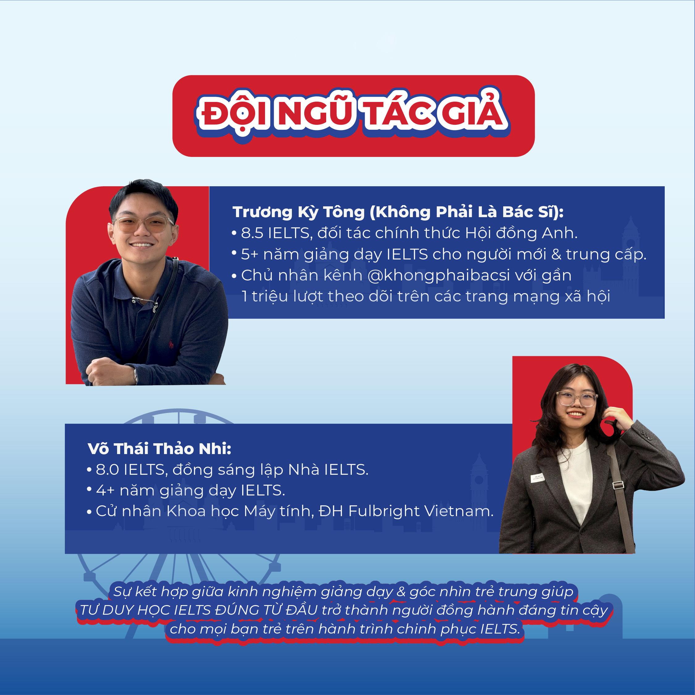• Các bạn muốn nâng band IELTS nhưng gặp khó khăn trong việc nâng điểm vì thiếu tư duy đúng và phương pháp học phù hợp. Về tác giả: Trương Kỳ Tông, hay còn được biết đến rộng rãi trong cộng đồng học IELTS với biệt danh “Không Phải Là Bác Sĩ”, gây ấn tượng mạnh bởi loạt thành tích khủng: cựu học sinh Chuyên Trần Đại Nghĩa, tốt nghiệp THPT Grand Prairie Collegiate Institute (Mỹ) vào năm 16 tuổi, đạt số điểm gần như tuyệt đối trong kỳ thi IELTS với band 8.5, đối tác chính thức của Hội đồng Anh, sở hữu 5 năm giảng dạy IELTS cho người mới và trung cấp. Trong lần ra mắt này, Kỳ Tông kết hợp cùng tác giả Võ Thái Thảo Nhi - cựu học sinh Chuyên Lê Hồng Phong, để biên soạn nên cuốn sách “Tư Duy Học IELTS Đúng Từ Đầu”. Thảo Nhi cũng là đồng sáng lập Nhà IELTS cùng Kỳ Tông, với loạt thành tích có thể kế đến như IELTS 8.0, 4 năm kinh nghiệm dạy tiếng Anh, cử nhân khoa Khoa học máy tính, ngành phụ Toán Ứng dụng trường ĐH Fulbright Vietnam. Đánh giá từ chuyên gia: Nếu biết đến Tư duy học IELTS đúng từ đầu sớm hơn, chắc chắn ngày xưa m.ình đã cải thiện điểm nhanh hơn từ mức 4.0. Cuốn sách chỉ ra những thói quen sai phổ biến và đưa ra cách tiếp cận tiếng Anh tự nhiên như người bản xứ. Đây là điều không dễ làm được nếu chỉ học theo cách thông thường, nhưng sách đã giúp người học từng bước sửa những "tật khó bỏ" đó. Với sự thực tế và hài hước, cuốn sách khiến việc luyện IELTS trở nên dễ tiếp cận và bớt áp lực hơn nhiều. - Bùi Thành Việt - IELTS 8.5, tác giả bộ sách IELTS WRITING JOURNEY With 15 years of experience teaching IELTS, I find this book refreshingly clear in how it challenges old learning habits and reframes the path forward. It makes IELTS preparation genuinely approachable and helps learners build the right foundations from the start. I especially value the dedicated section on concentration - practical strategies to cultivate focus and apply it effectively when working through IELTS practice tests. These insights are concrete, realistic, and too often missing from exam guides. If you’re stuck and struggling to raise your band score, this book could be the reset you need. - Jack Zissler (@) - Cựu giám khảo Ielts | Giám gốc 195Global JSC
