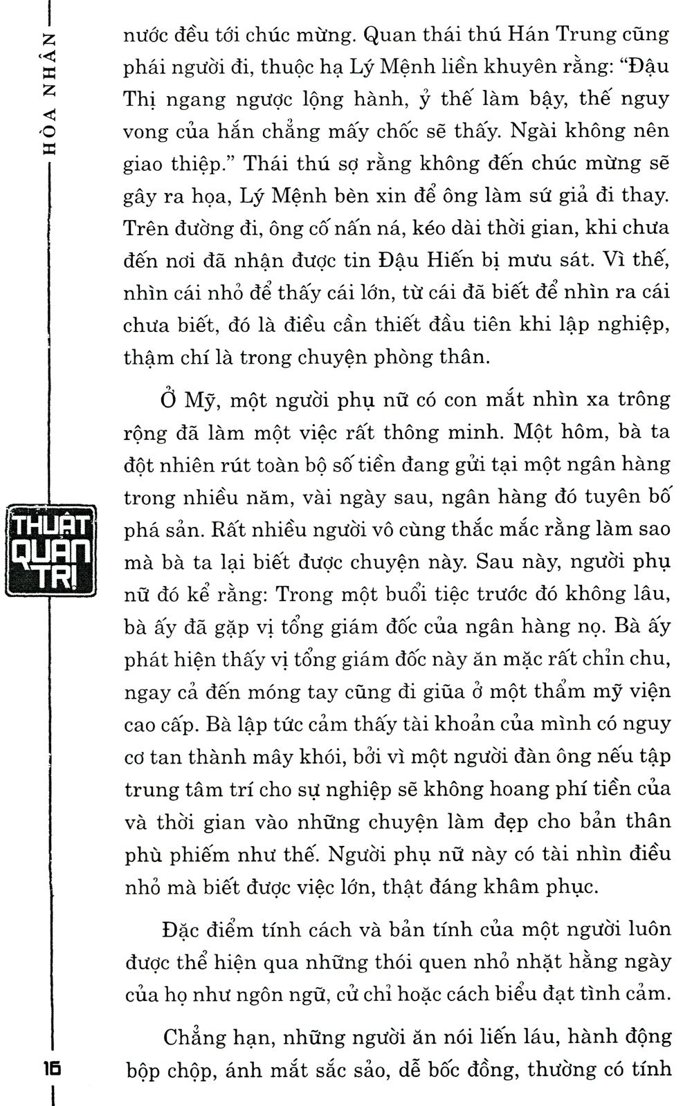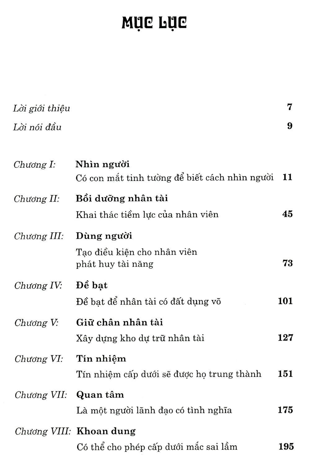 Việc quản lý của người lãnh đạo có nhiều tầng bậc khác nhau, bậc đầu tiên là xây dựng chế độ quản lý để mọi người đều phải tuân theo; bậc tiếp theo là việc dù lớn hay nhỏ, ai nấy cũng đều phải chăm chỉ cần cù; bậc cao hơn nữa là tạo dựng uy quyền, mệnh lệnh đưa ra buộc phải chấp hành; tiếp nữa là làm gương cho cấp dưới làm mọi người đồng tâm nhất trí; cuối cùng là quản lý người theo ý m.ình nhưng dưới hình thức quản mà như không quản. Cũng giống như một nước đi đúng đắn cứu sống cả ván cờ, một câu nói ấm áp đổi lại sự trung thành, một đôi mắt tinh tường khiến nhân tài kéo về tề tựu, triết lý này tưởng chừng như vô hình nhưng thực ra lại chính là con đường để đi đến thành công trong quản lý con người.