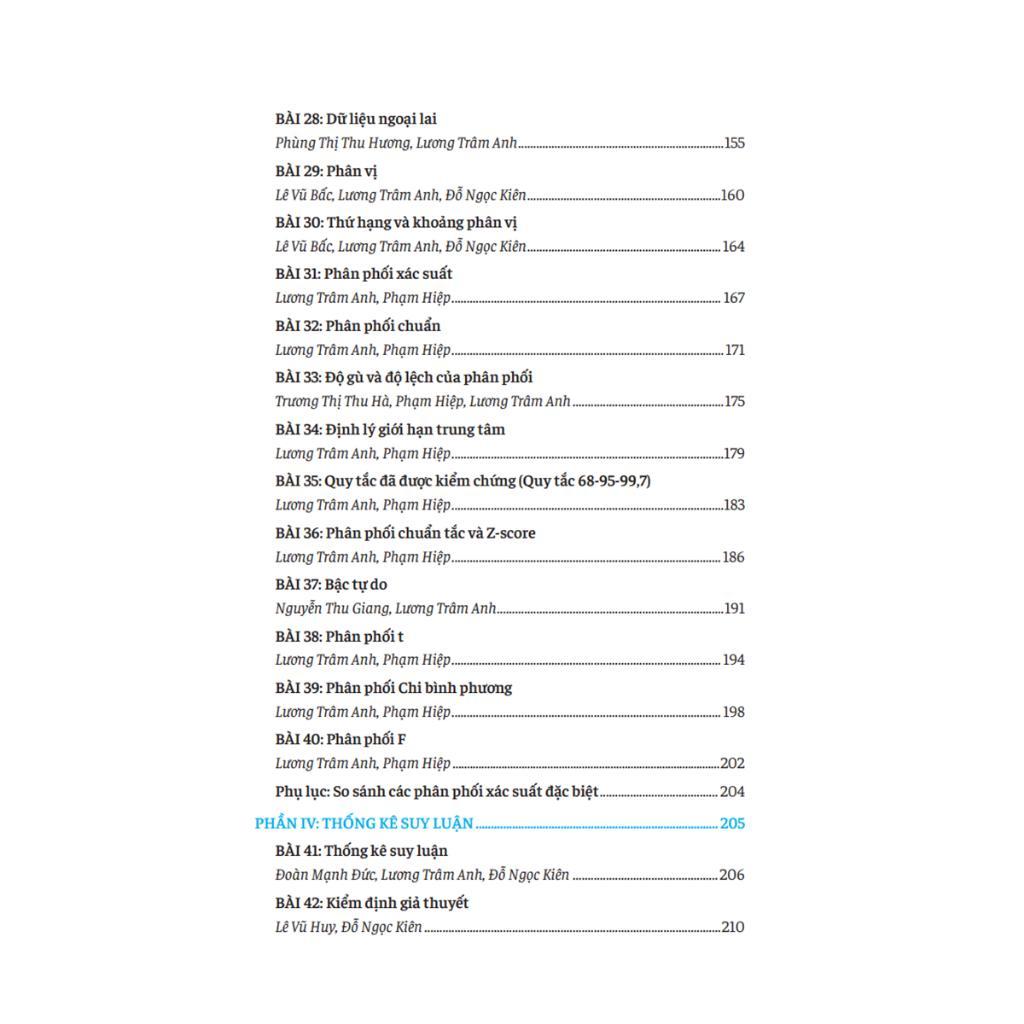 • Phần 3: Thống kê mô tả: Biểu đồ, phương sai và độ lệch chuẩn, dữ liệu ngoại lai, phân vị, phân phối, quy tắc, bậc tự do,...