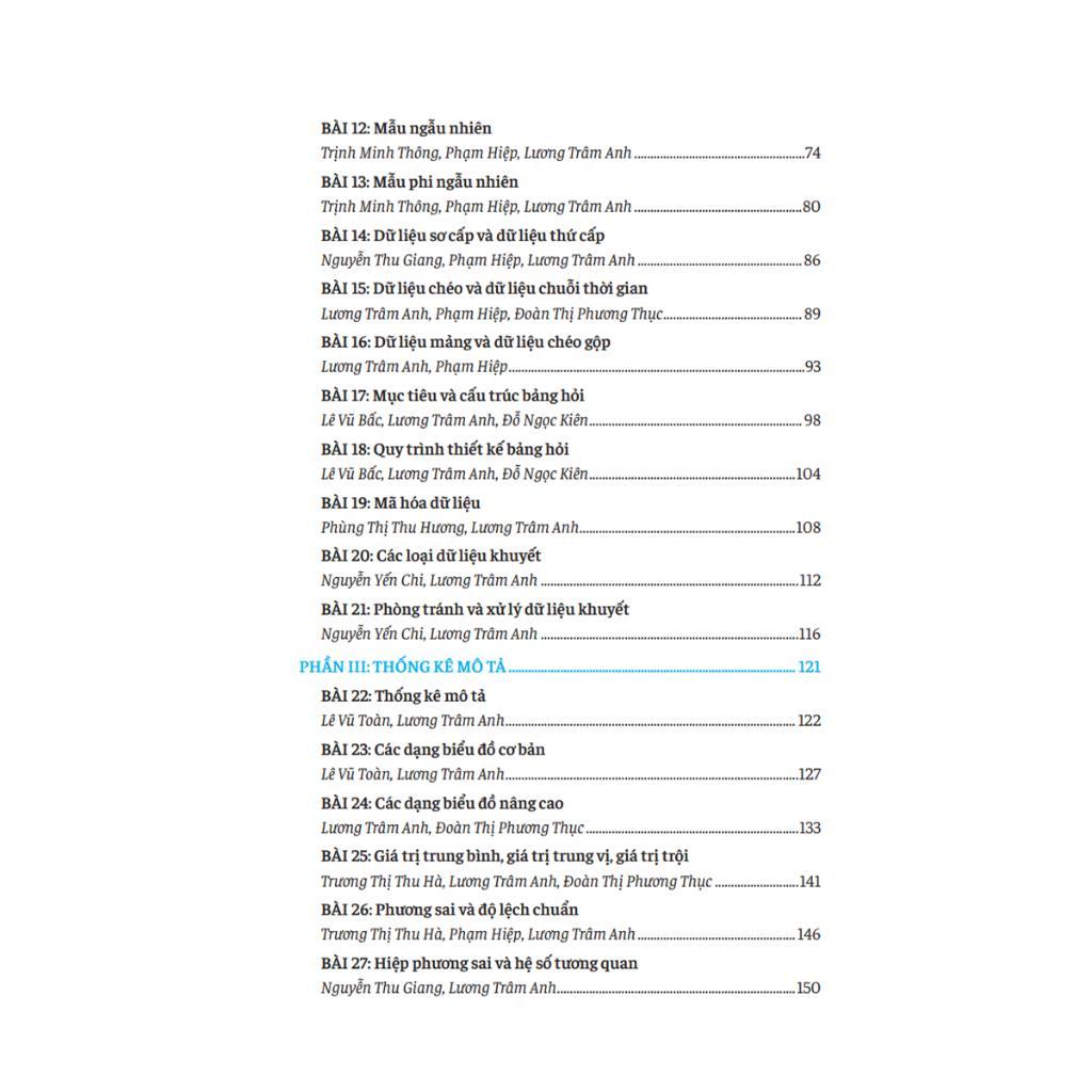 • Phần 2: Thu thập dữ liệu: Tổng thể và mẫu, luật số lớn, bảng hỏi, dữ liệu sơ cấp và thứ cấp, mã hóa dữ liệu, dữ liệu khuyết...