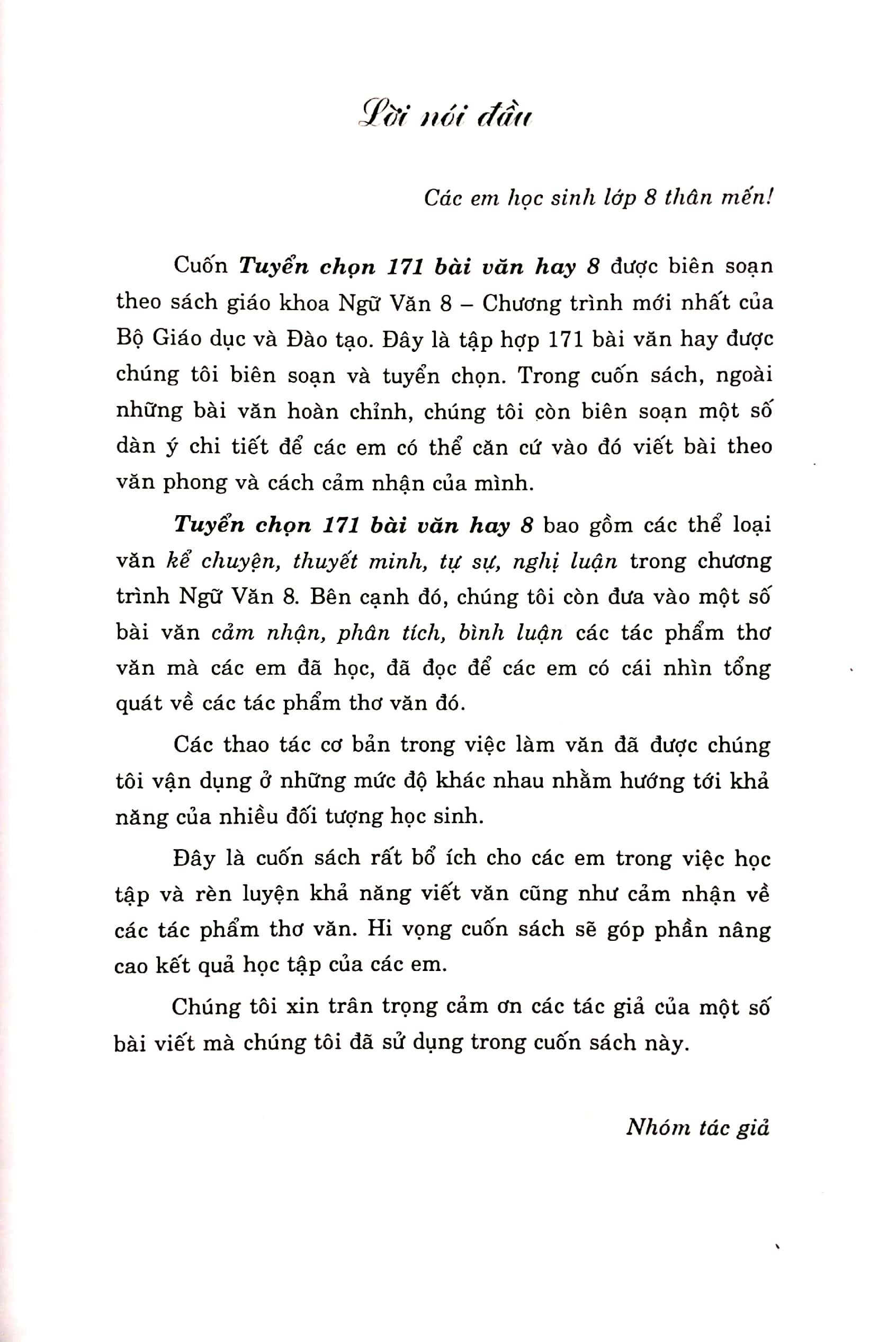 Tuyển Chọn 171 Bài Văn Hay 8 (Theo Chương Trình Giáo Dục Phổ Thông Mới) Sáchđược biên soạn theo sách giáo khoa Ngữ Văn 8 – Chương trình mới nhất của Bộ Giáo dục và