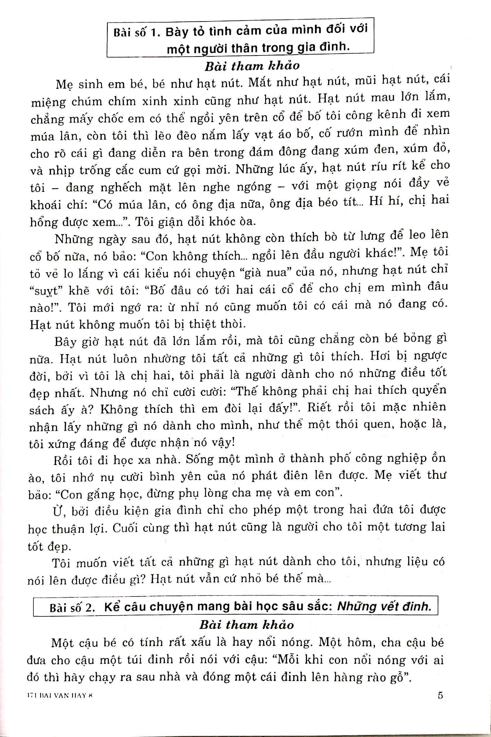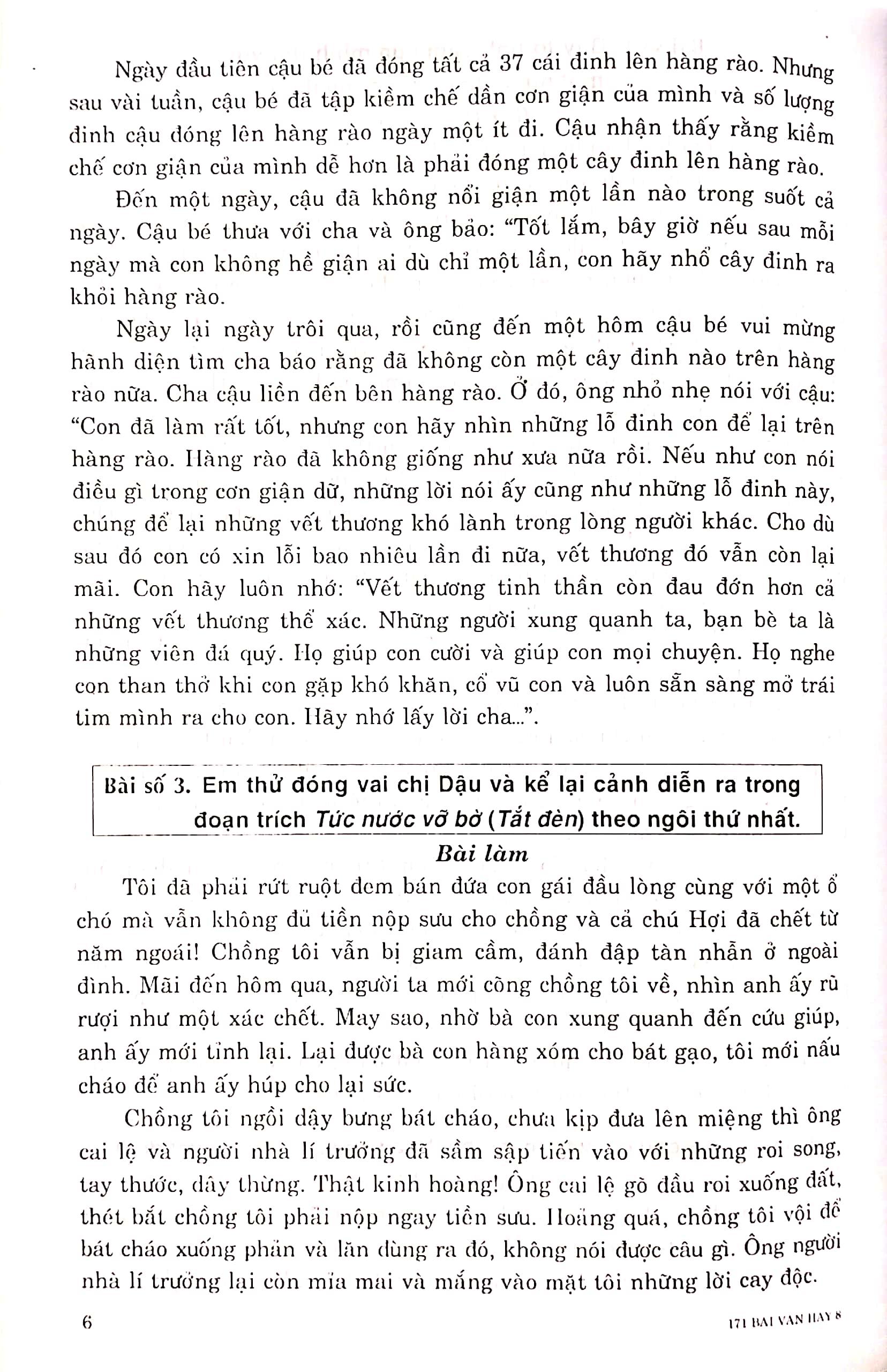 Sáchđược biên soạn theo sách giáo khoa Ngữ Văn 8 – Chương trình mới nhất của Bộ Giáo dục và Đào tạo. Đây là tập hợp 171 bài văn hay được chúng tôi biên soạn và tuyển chọn. Trong cuốn sách, ngoài những bài văn hoàn chỉnh, chúng tôi còn biên soạn một số dàn ý chi tiết để các em có thể căn cứ vào đó viết bài theo văn phong và cách cảm nhận của m.ình.