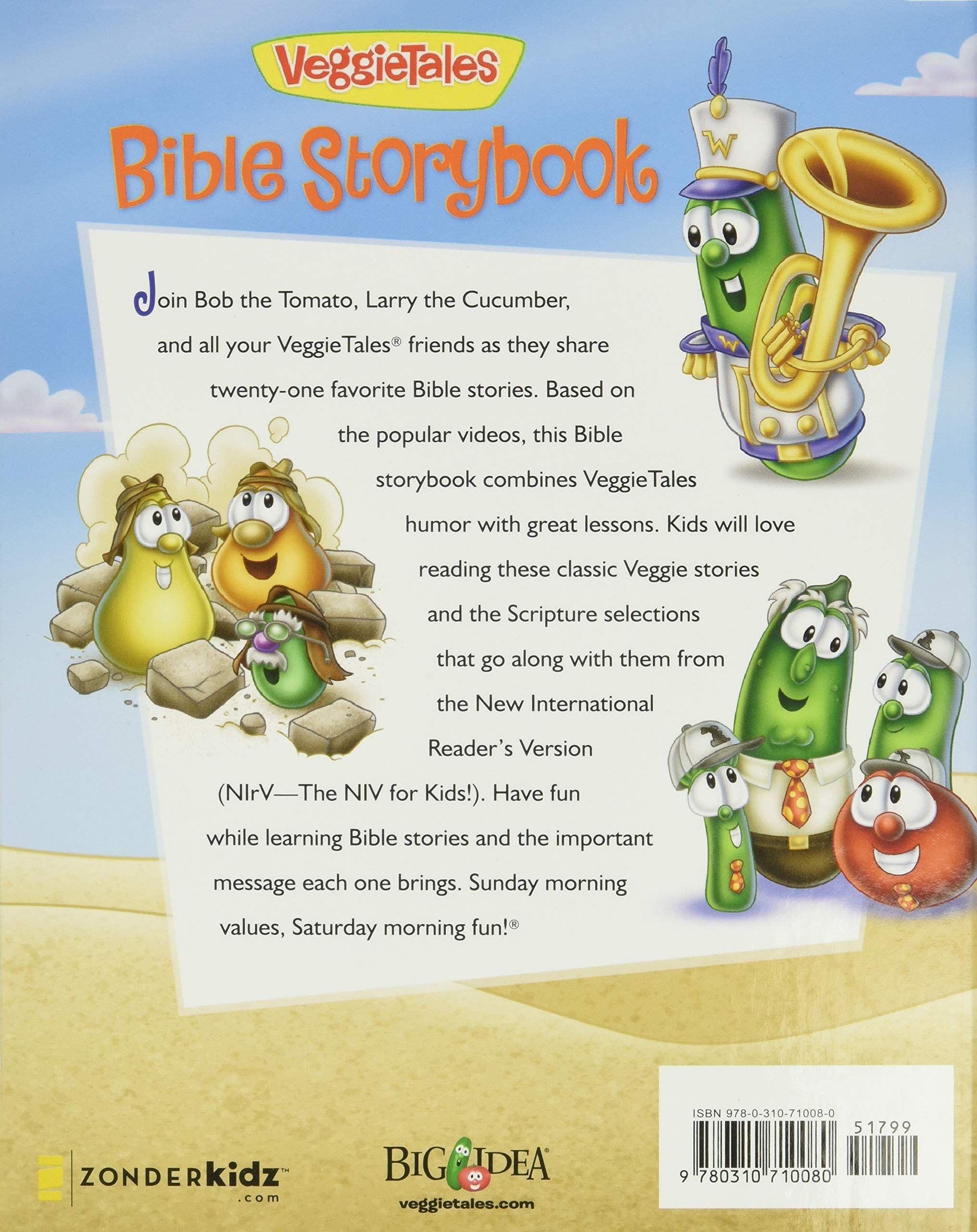 ---------------------------------------- Join Bob the Tomato, Larry the Cucumber, and all your VeggieTales friends as they share twenty favorite Bible stories. Based on the popular videos, this Bible storybook combines VeggieTales humor with great lessons. Kids will love reading these classic Veggie stories and Scripture selections that go along with them from the New International Reader's Version (NIrV--The NIV for Kids!) Have fun while learning Bible stories and the important message each one brings. Sunday morning values, Saturday morning fun!