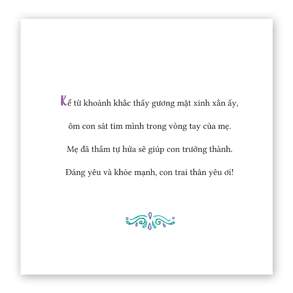 Đây là một cuốn sách ấm áp và sâu sắc, khám phá mối quan hệ đặc biệt giữa mẹ và con trai, nhấn mạnh vai trò thiết yếu của người mẹ trong cuộc đời cậu bé. Nó mang đến một hành trình cảm xúc với những trải nghiệm an toàn, ấm áp mà mẹ dành cho con, giúp dạy con sự tự tin, tình yêu thương và khả năng chấp nhận người khác, để con có thể trở thành một người đàn ông tốt trong tương lai.