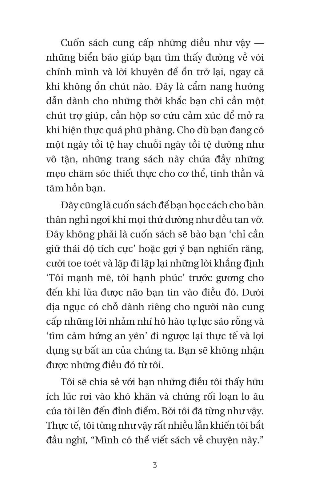 Đây là cuốn sách viết về sức khỏe tinh thần, hướng dẫn , tự chăm sóc bản thân dành cho những ngày bạn cảm thấy cô đơn, những ngày mọi sự tan vỡ hoặc quá bất lực, xuống tinh thần. Với cách suy nghĩ thấu cảm, hài hước và trung thực, tác giả đề ra những giải pháp, hướng dẫn giúp bạn tìm ra con đường trở về với chính mình.