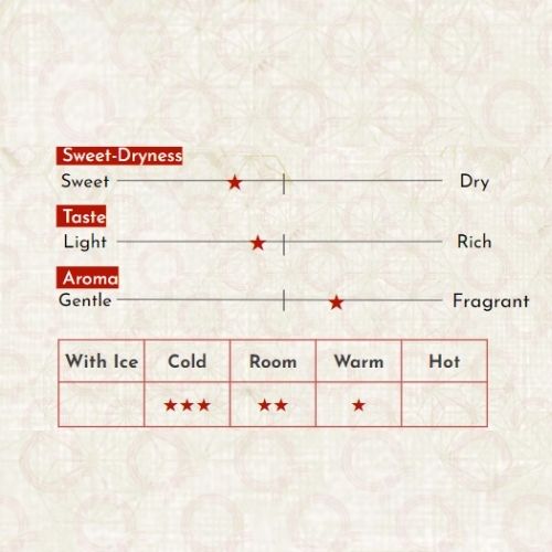 NGƯỜI DƯỚI 18 TUỔI KHÔNG ĐƯỢC UỐNG RƯỢU, BIA Xuất xứ: Nhật Bản Thành phần: Gạo, nước, men rượu Hàm lượng Ethanol: 14.7% Hướng dẫn sử dụng: Uống trực tiếp, uống nóng hoặc lạnh Hướng dẫn bảo quản: Bảo quản