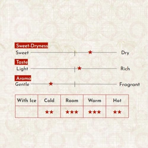 Được ủ trong thùng gỗ tuyết tùng ngay trước khi đóng chai, loại rượu Sake Taru ("thùng") này bùng nổ với hương vị nồng nàn và đặc sắc. Có vị cay và hương thơm thảo